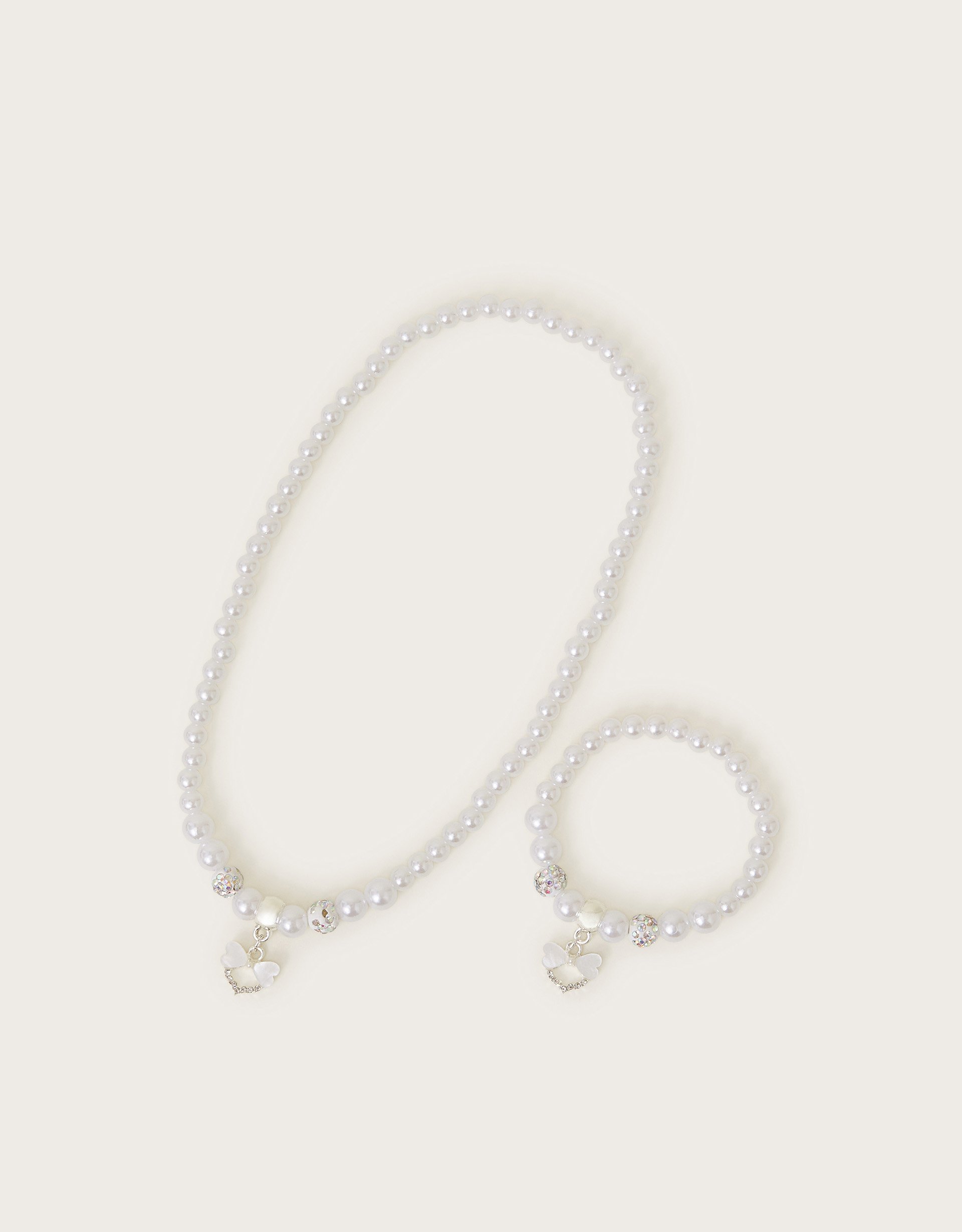 Finishing touches. Get them ready for their day of duties with this jewellery set. Comprised of a matching necklace and bracelet, each piece is threaded with faux pearls and a heart bow charm.
