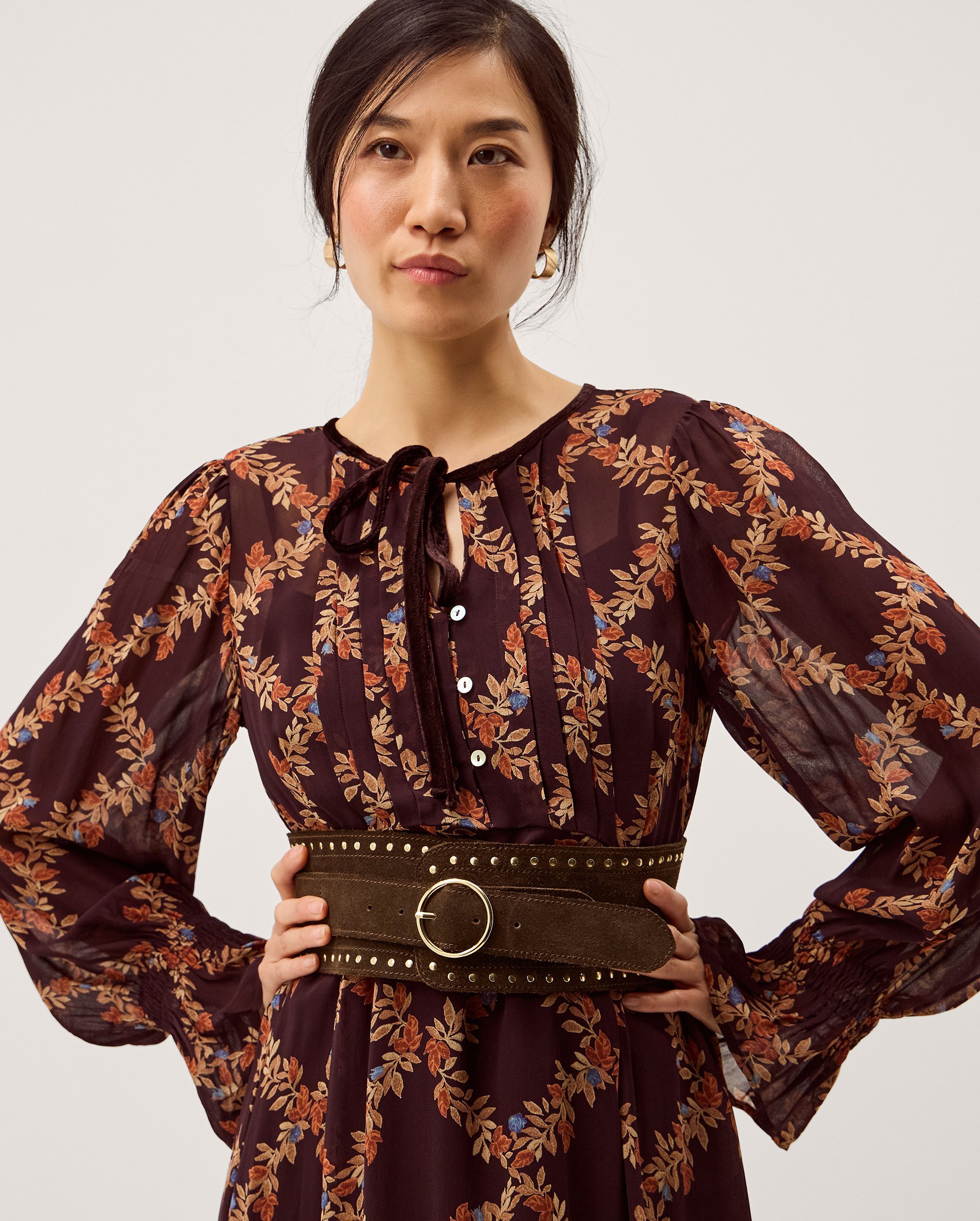 Back like it never left. Delicately studded, this suede leather belt is sure to become your accessory of the season. Designed with a thicker width and gold-tone buckle, it's best styled on top of flowy dresses or satin skirts. Please note that due to the nature of this piece, colour may run when wet and cause staining on lighter clothing. Brown