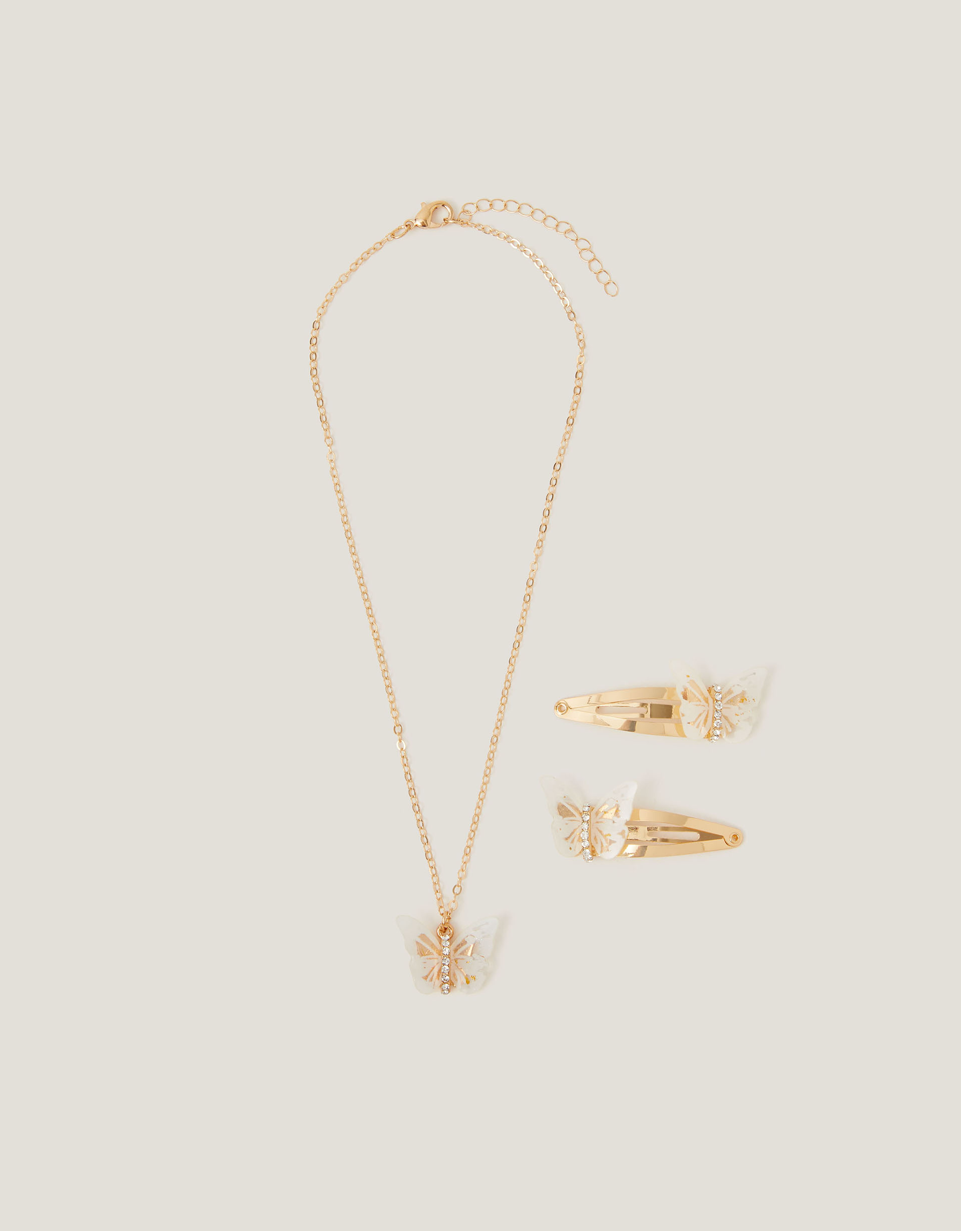 We've got butterflies! Add a bit of sparkle to their party look with these gold-tone pieces. Embellished with glittery 3D butterflies, this hair clip and necklace set will become a cherished part of their jewellery box. All they need is a princess dress! Warning! Choking Hazard—Small parts. Not suitable for children under 3 years old.