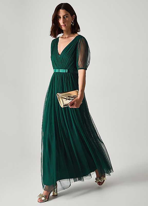 Monsoon Ellie Sheer Sleeve Plunge Tulle Maxi Dress - Dark Green - Size 22