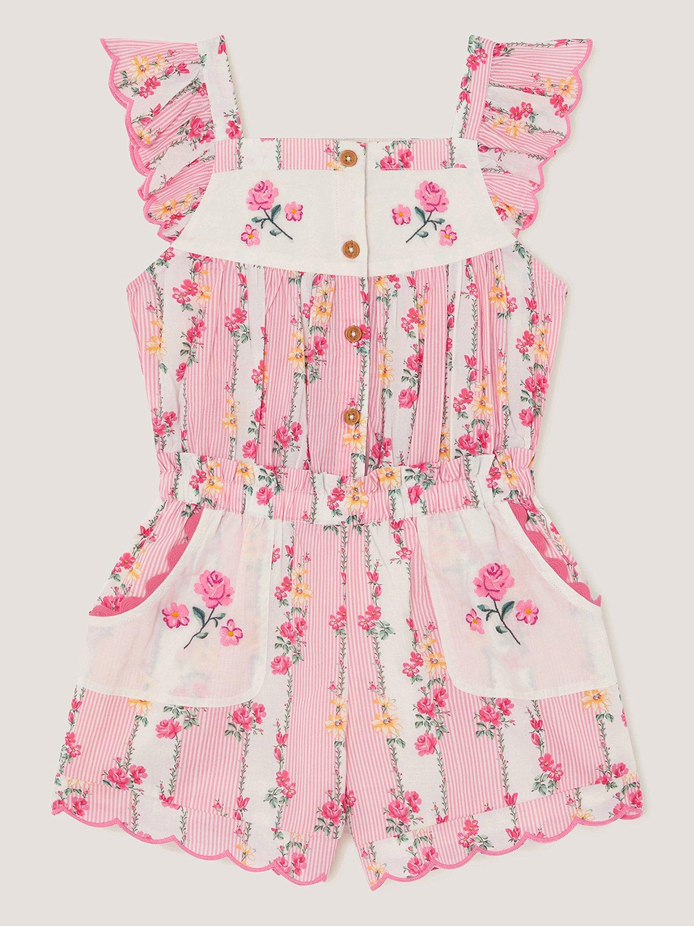 Monsoon Girls Country Charm Playsuit - Pink Easy Peasy! A Cute Pick For All Their Summer Adventures, This Playsuit Is Patterned With Pink Pinstripes, Springtime Florals And Scalloped Frills. Finished With Front Button Fastenings And Side Pockets. Material Content: Lining: Cotton 100%, Shell: Cotton 100% Washing Instructions: Machine Washable
