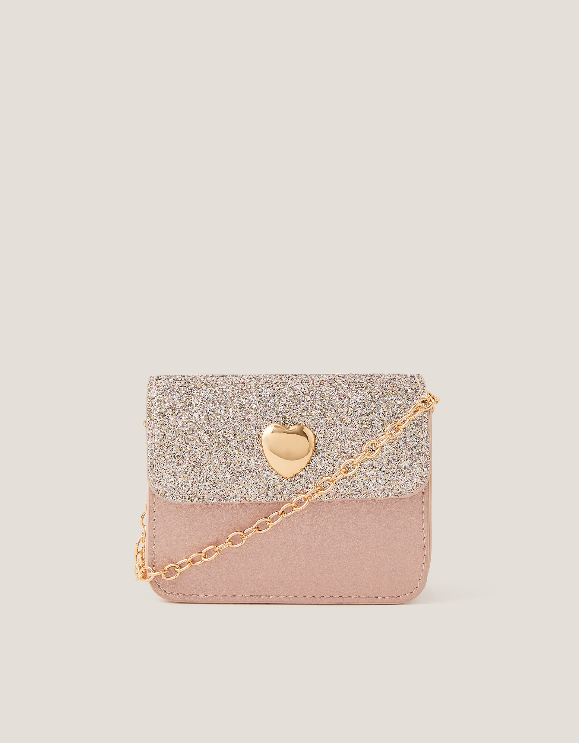 For everyday sparkles. Designed in a fold-over profile with gold heart-shaped hardware, this glittery bag comes with a long chain strap to sling over their shoulder or style across the body.