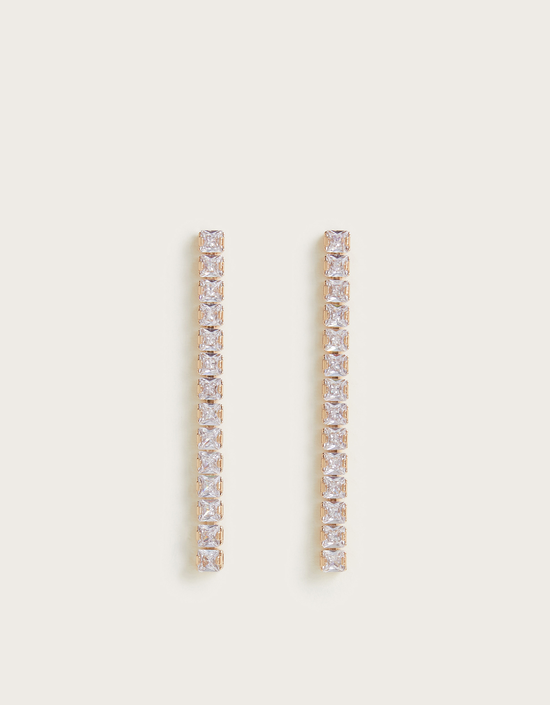 Taking glam to new dimensions. Perfect for adding a touch of sparkle to all your evening looks, these earrings comprise of a row of square diamante stones encrusted into gold-tone metal.Non-refundable.