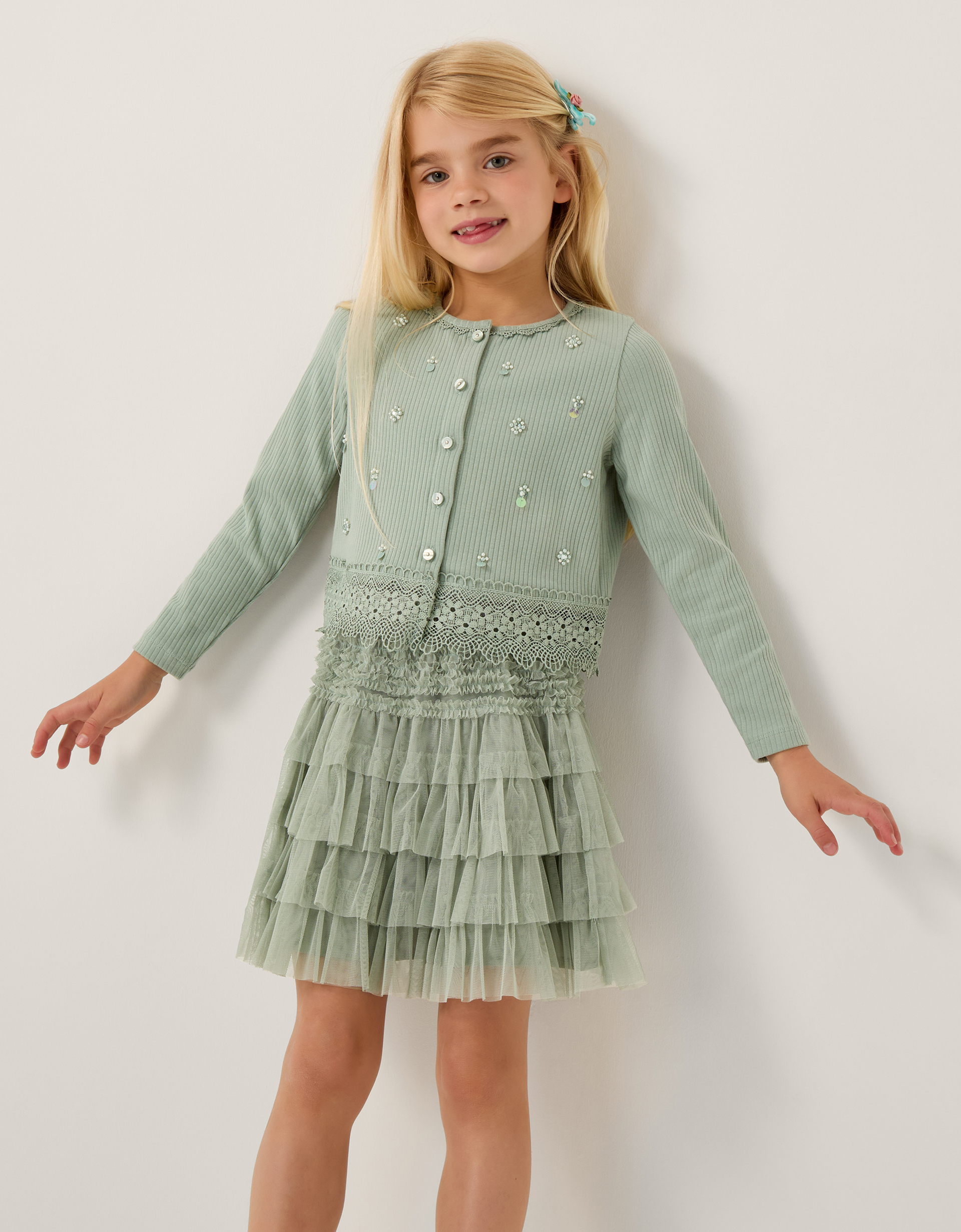 Party outfit sorted. Soaked in a soft sage green, this set includes a ribbed cardigan embellished with beads, sequins and floral lace, whilst the mesh skirt is made up of endless ruffles and tiers for a swish-worthy finish. All that's missing is their dancing shoes. Green