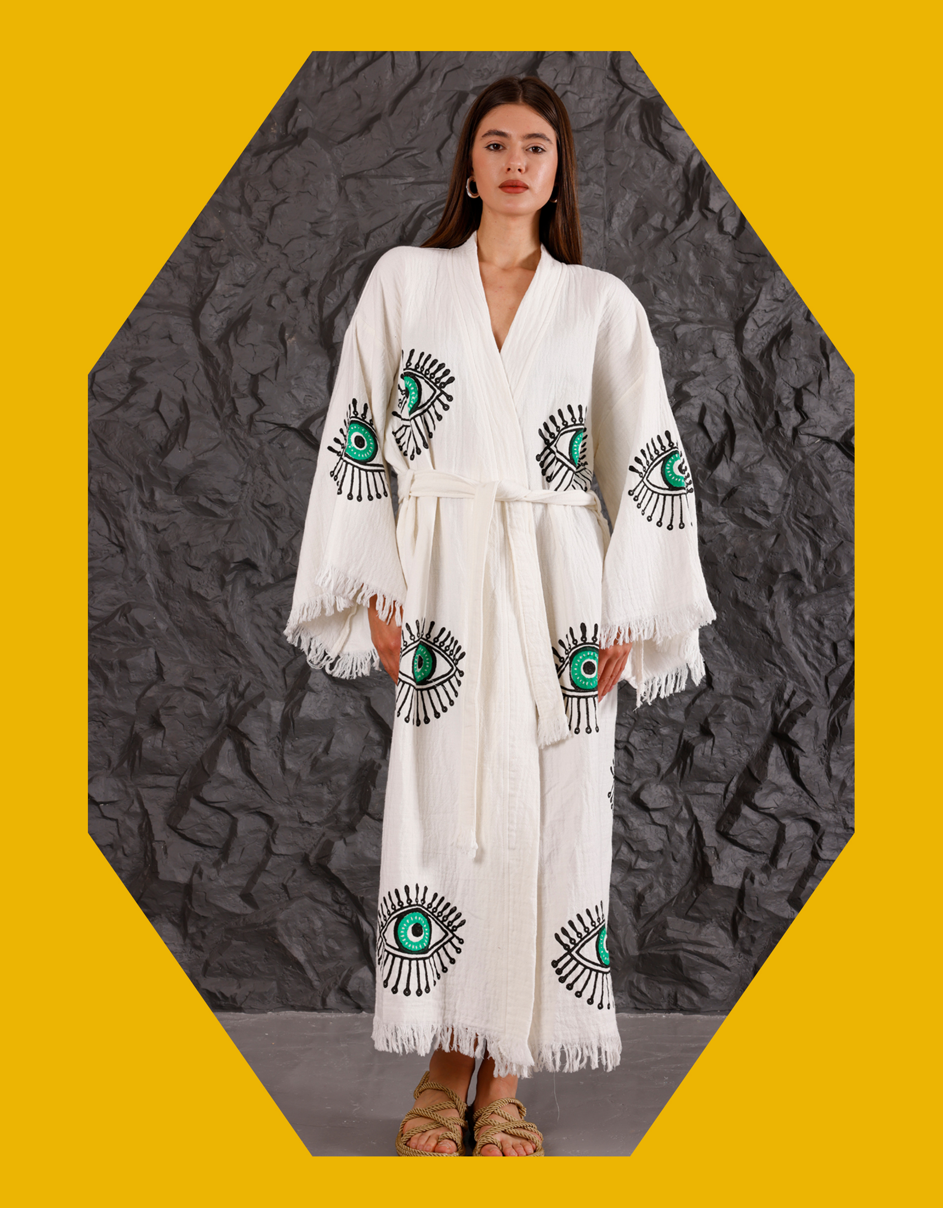The brand: Female founded and female run, Meraki Beach incorporates their manufacturing and Artisan craftsmanship to create luxury and chic resort wear.The product: All eyes on you. Designed in a kimono-inspired shape, this robe features bold eye motifs from sleeves to hem, with frayed finishes and a comfy tie fastening around the waist. A statement pick you can style over swimwear, your fave festival 'fit or pyjamas for wild nights in.The fabric and fit: Spun in soft organic cotton. One size (fits UK6-UK18). Green