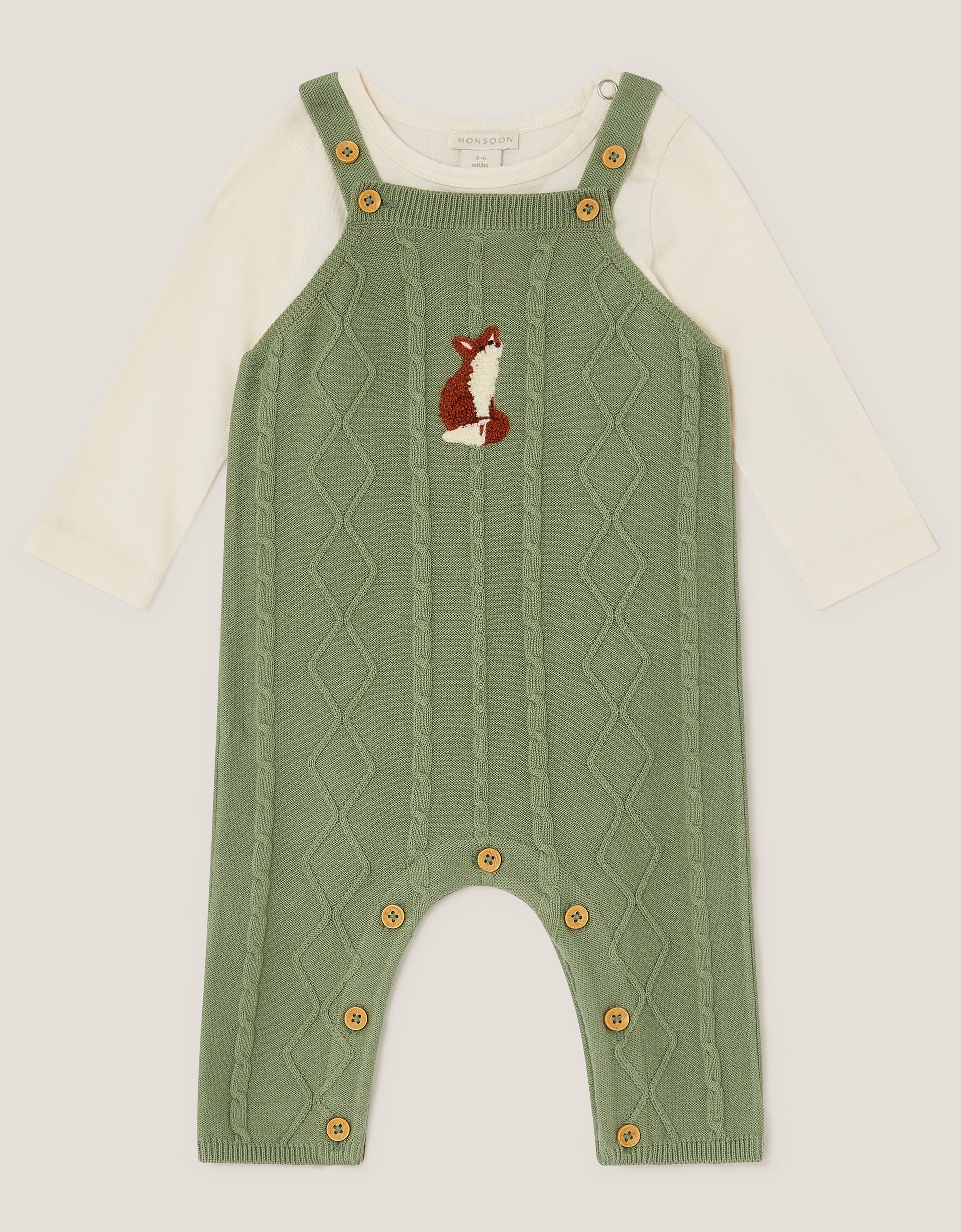 Hello, little pup. From playdates to snuggle sessions, this set is a cosy outfit they'll love wriggling around in. Features sage green cable knit dungarees with a cute fox design on the front, and a plain long sleeve top to style underneath. Fastens with buttons at the neckline, straps and leg seams for easy dressing (and nappy changing)! Green