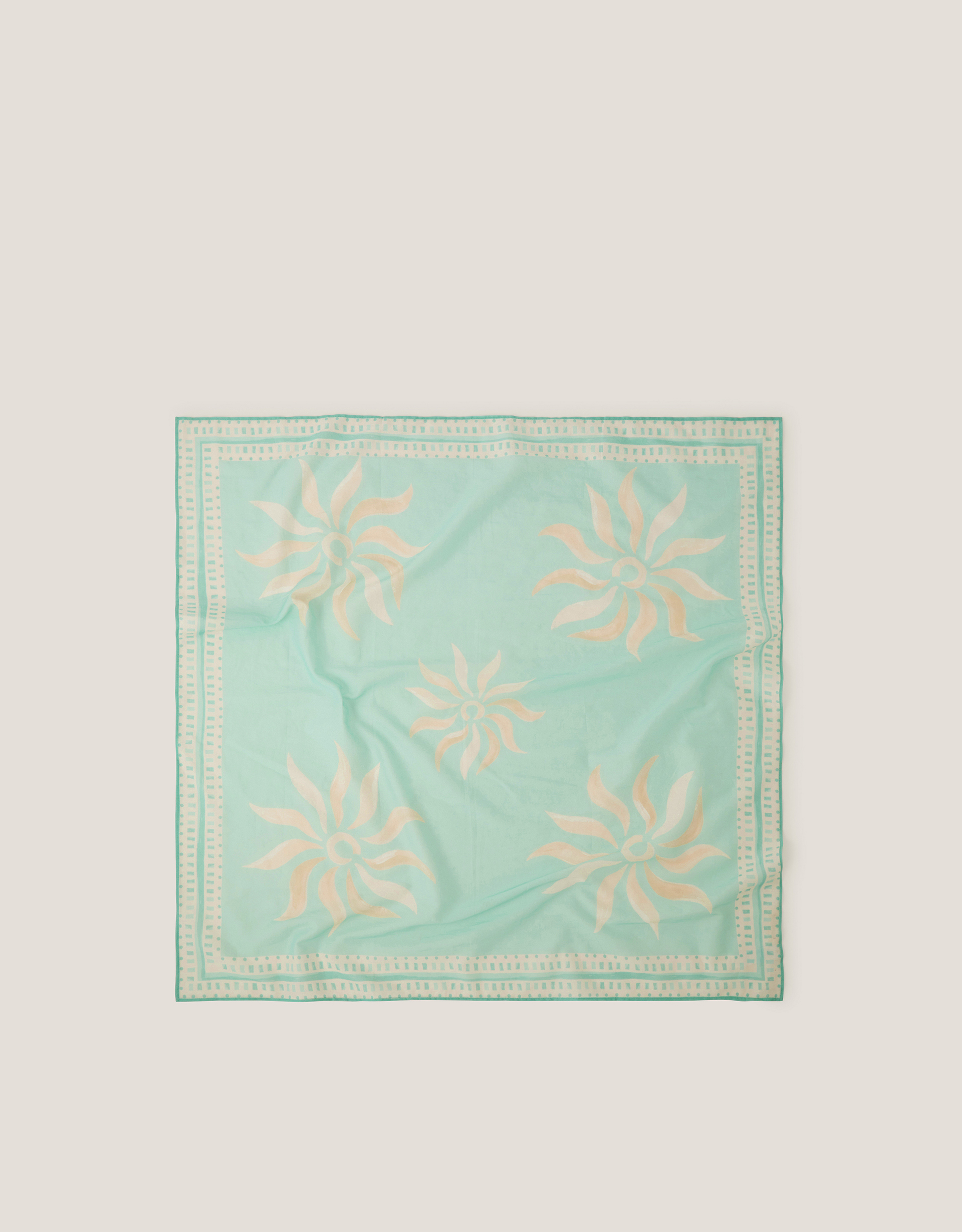 For the sun-kissed and blissed. Dipped in seafoam green, this cotton scarf features sun motifs with a golden border. Made to be draped over your shoulders or knotted around your neck, you'll reach for it year after year.