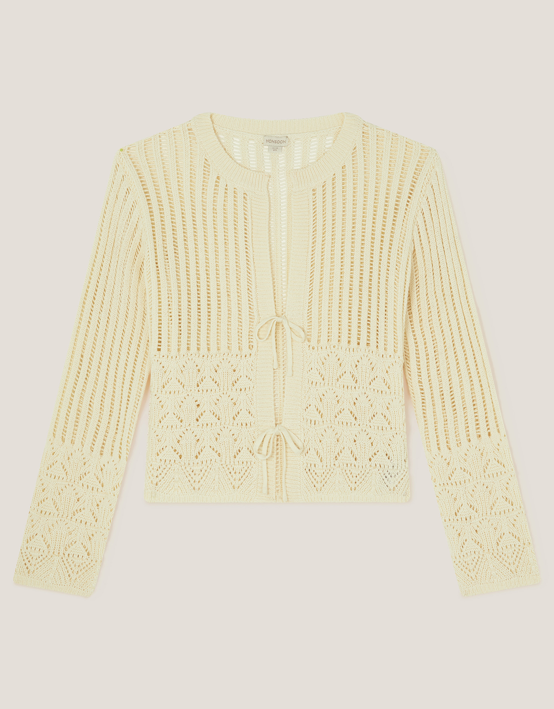Oh-so-chic. Knitted to a ribbed finish, this super-cute cardi pairs perfectly with their favourite jeans. Fastens through the front with ties, long sleeves, and a round neckline. Non-uniform day, here we come! Ivory
