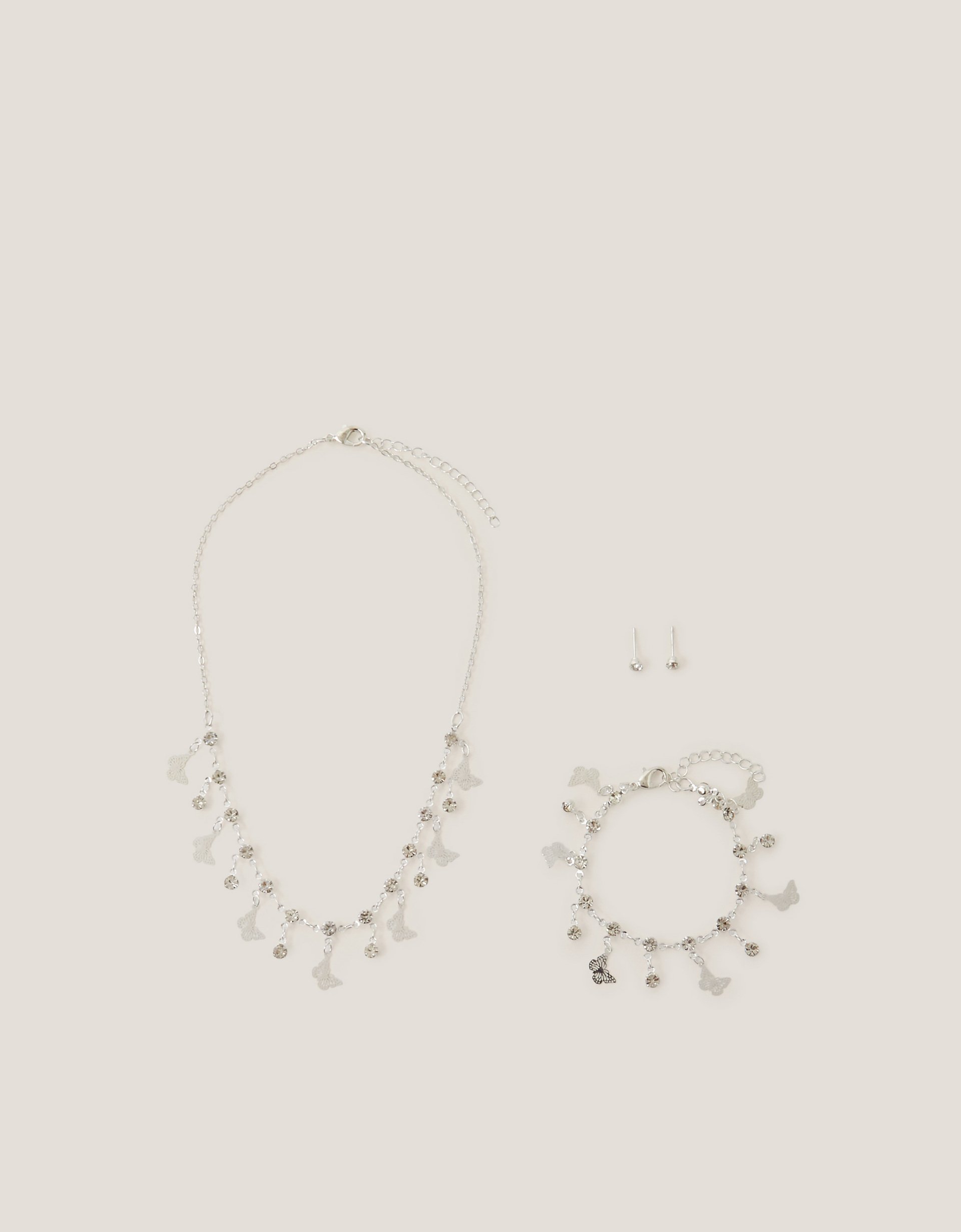 For those who take dress-up seriously. Designed in a silver tone and decorated with butterfly charms and dazzling jewels, this jewellery set included a necklace, bracelet and stud earrings. Sold as a set.Non-refundable.Warning! Choking Hazard—Small parts. Not suitable for children under 3 years old.