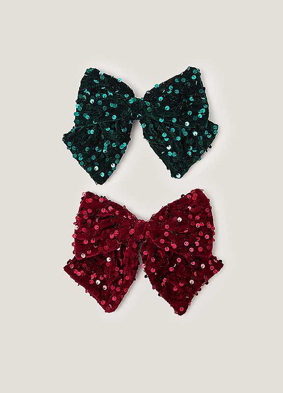 Made from velvet and bedazzled with shimmery sequins, these festive hair bows are a cute addition to their looks at Christmastime.Pack of 2Wipe clean60% Polyester, 30% Iron, 10% PlasticWarning! Choking Hazard Small parts. Not suitable for children under 3 years old.