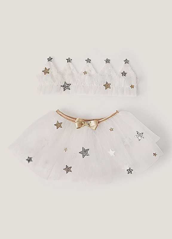Queen of Dress-Up! With this in their playtime box, they'll always be the star of the show. Made from tulle with glitzy star embellishments, the set includes a ribbon-tied crown and cape to match.Wipe cleanSet Part 1: 5% Plastic, 95% PolyesterSet Part 2: 5% Plastic, 95% Polyester | tulle mini skirt, childrens tutu skirt, white tulle skirt, layered tulle skirt