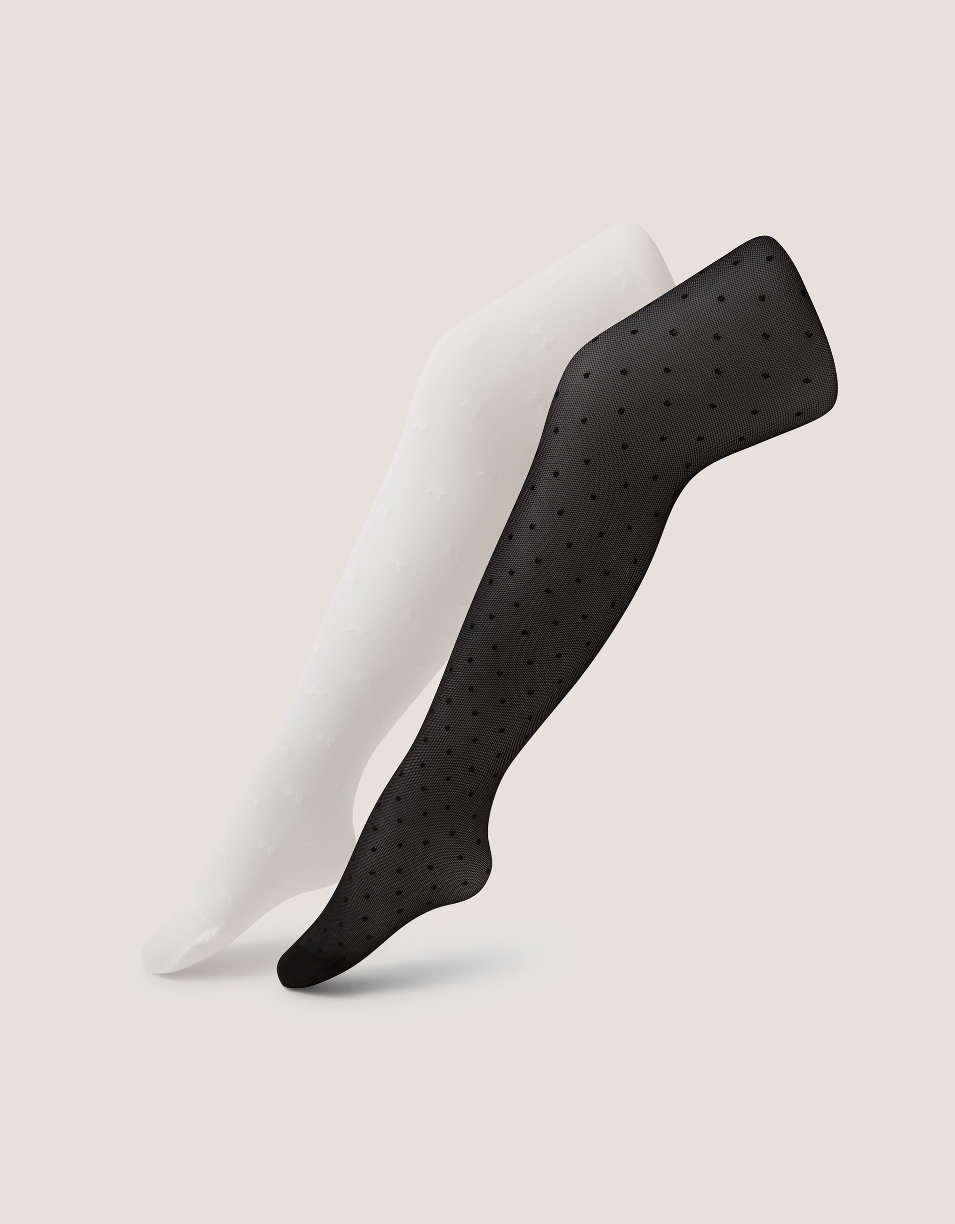 A sock drawer staple. The perfect touch to any party look, these sheer tights have been designed in a soft blend and topped with polka dots and bows. Cute, right? Two pairs included. White tights are 30 denier and black tights are 20 denier. Non-refundable. Multi