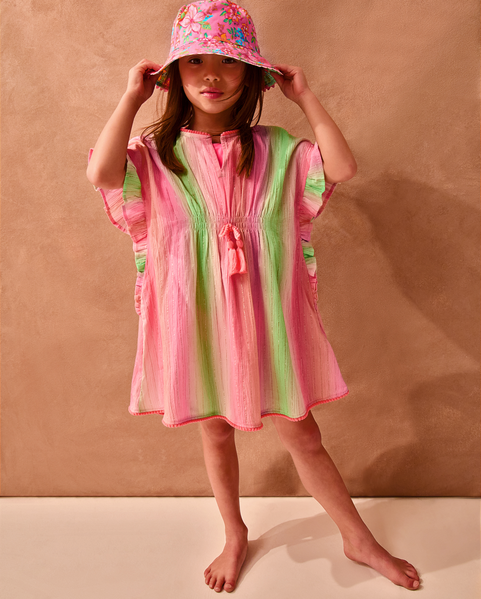 Turn up the brightness! For days spent beachside, this kaftan is an essential. Made in breathable cotton, it's decorated with colourful ombré stripes and glitzy accents that sparkle like golden hour. Finished with frilly trims and drawstring tassels at the waist. Multi