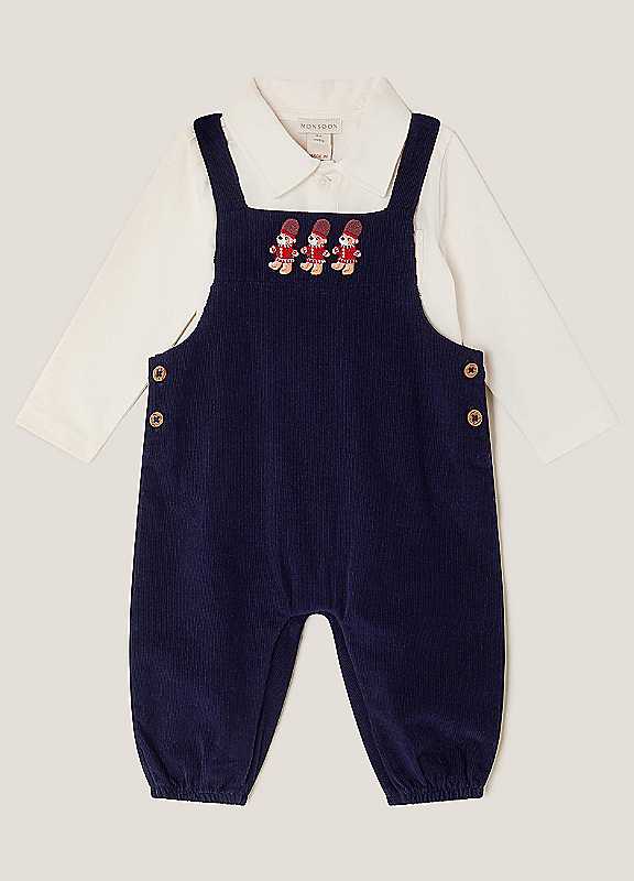 An outfit that'll make everyone go 'awww'. Featuring a plain white polo shirt and navy corduroy dungarees, this set is embroidered with King's Guard bears marching across the square neckline.Machine washable100% Cotton