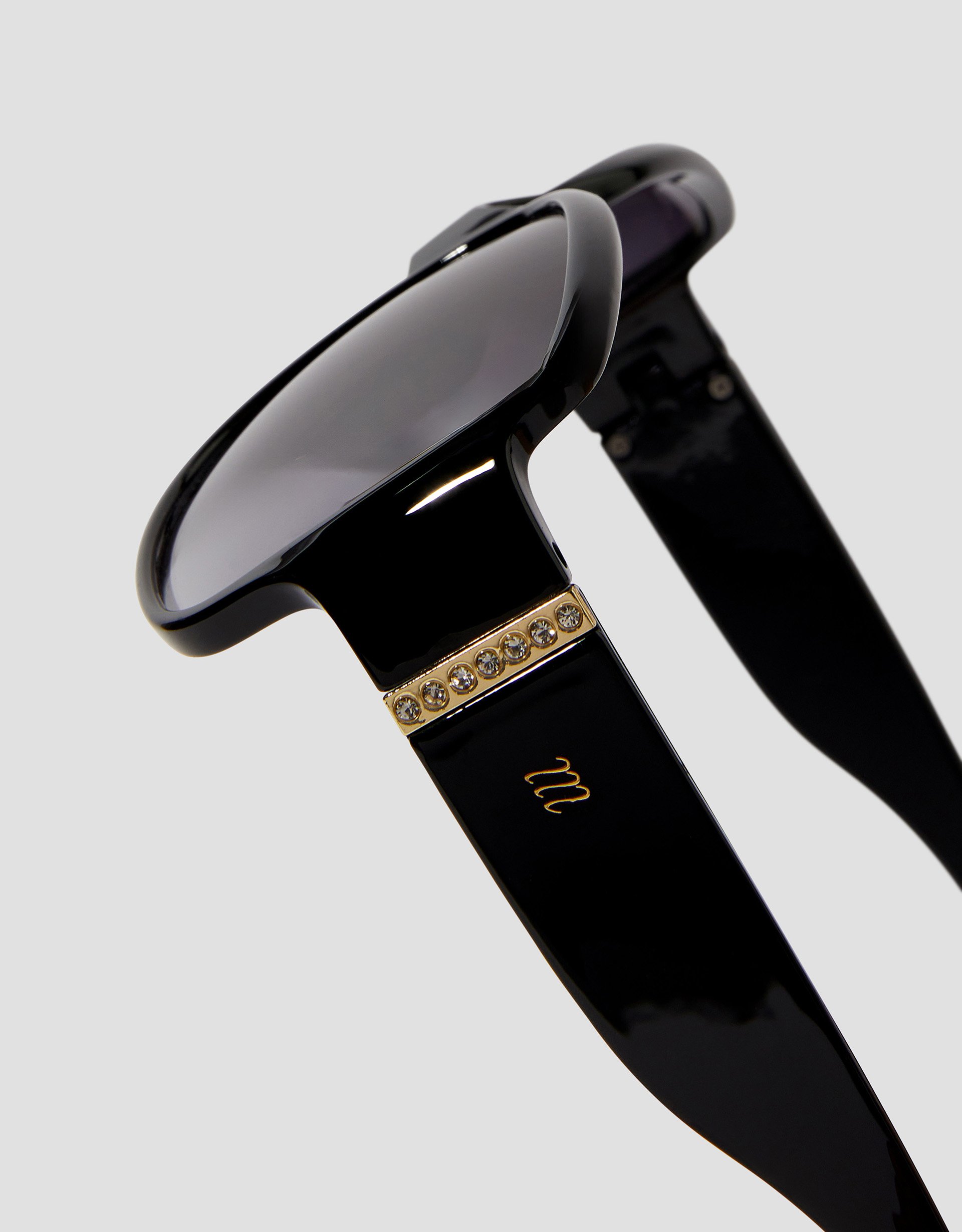 Very Audrey Hepburn. Hosted in black with dark-tinted lenses, these statement sunglasses are designed in a curvy square shape with rows of diamantes at the temples.