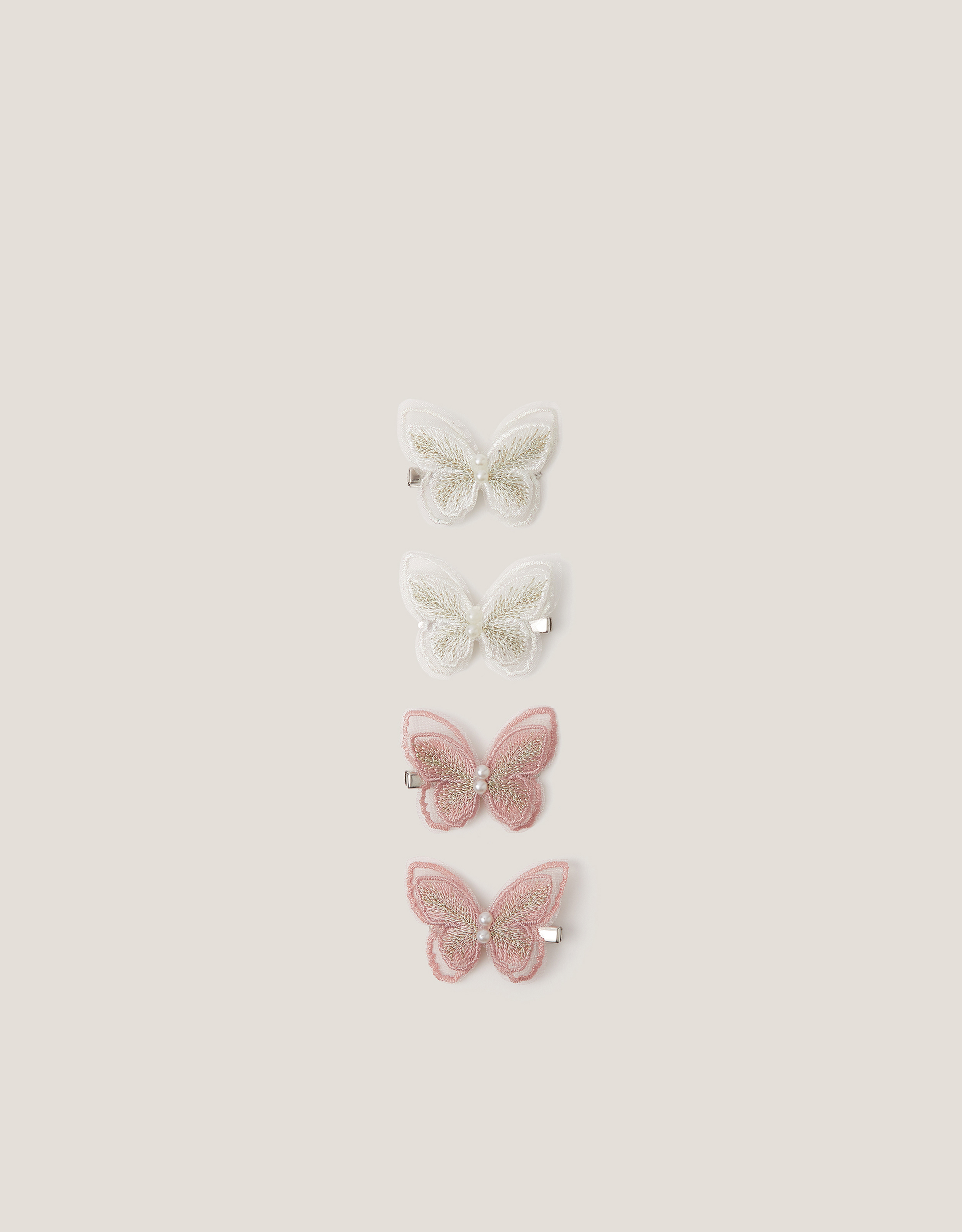 Princess approved. Delicately embroidered and topped with mini pearl beads, these butterfly hair clips are made for days out, frolicking in fields. Finished with silver-tone side clip fastenings. Four clips included.Warning! Choking Hazard—Small parts. Not suitable for children under 3 years old. Pink