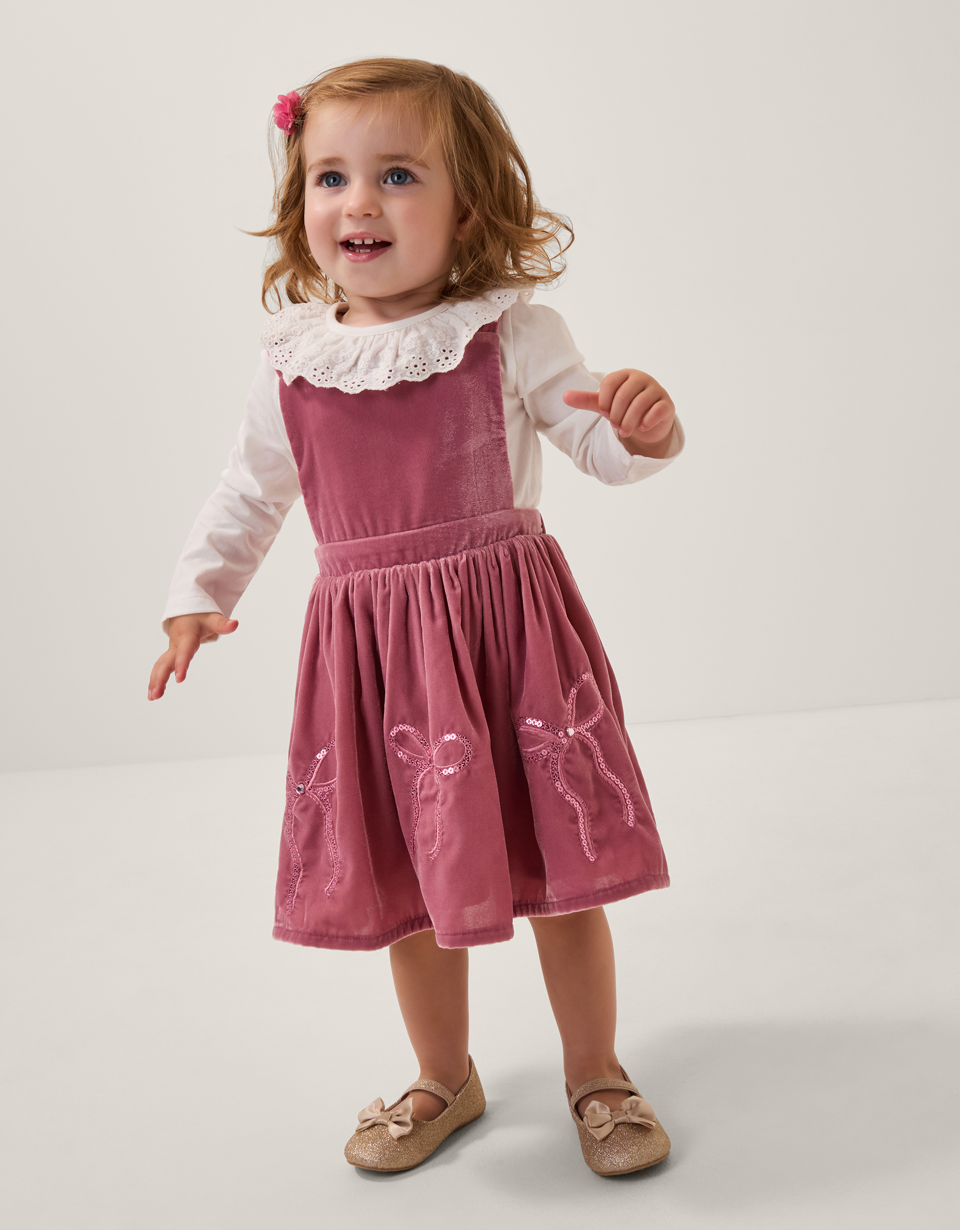 Bows: making everything cuter since the beginning of time. An outfit baby can wear any day and receive endless oohs and awws. The set includes a long sleeve top with a frilly broderie collar, and a pink velvet pinny dress embellished with sequin bows. Pink