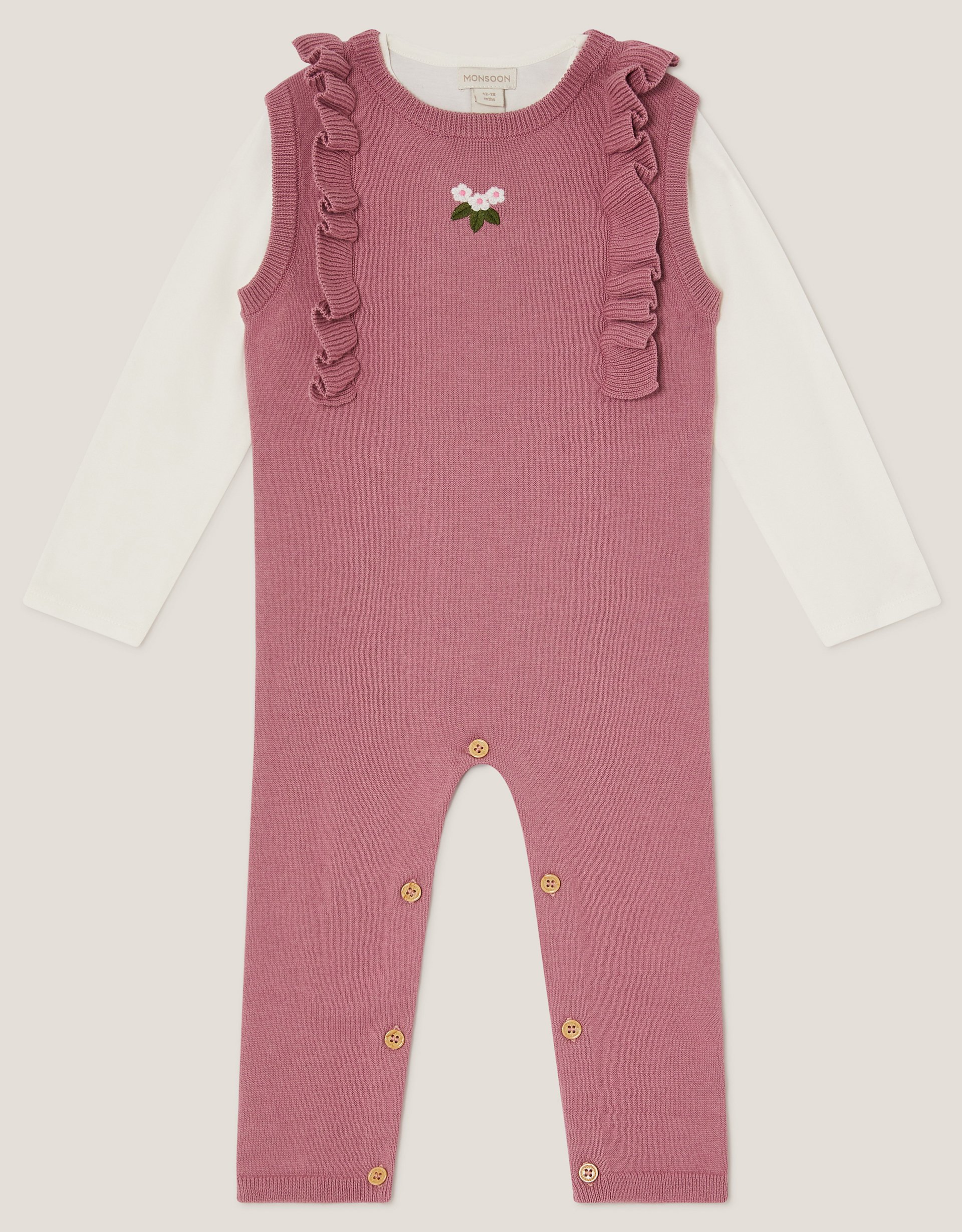 Cosy season. Keeping your little one warm and snuggly in style throughout the colder months. This set includes a plain long sleeve top and pink knitted dungarees embellished with frills and floral embroidery. Finished with button-up leg seams for easy dressing. Pink