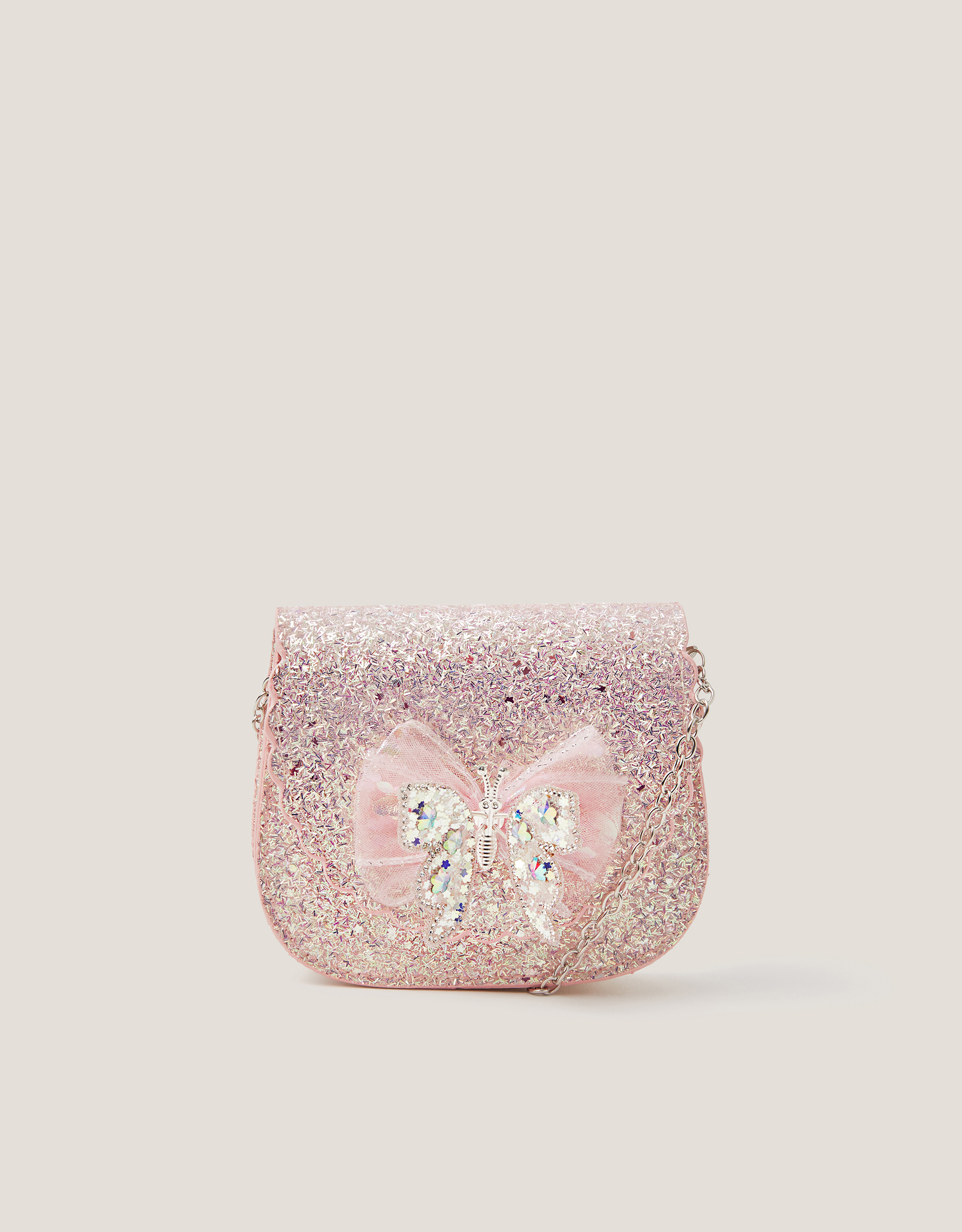 We don't take sparkles lightly around here... Coated in pink glitter, this gorgeous bag features a statement chiffon butterfly to the front and fastens with a magnetic snap to secure all their treasures. Finished with a long chain strap for crossbody styling, too!