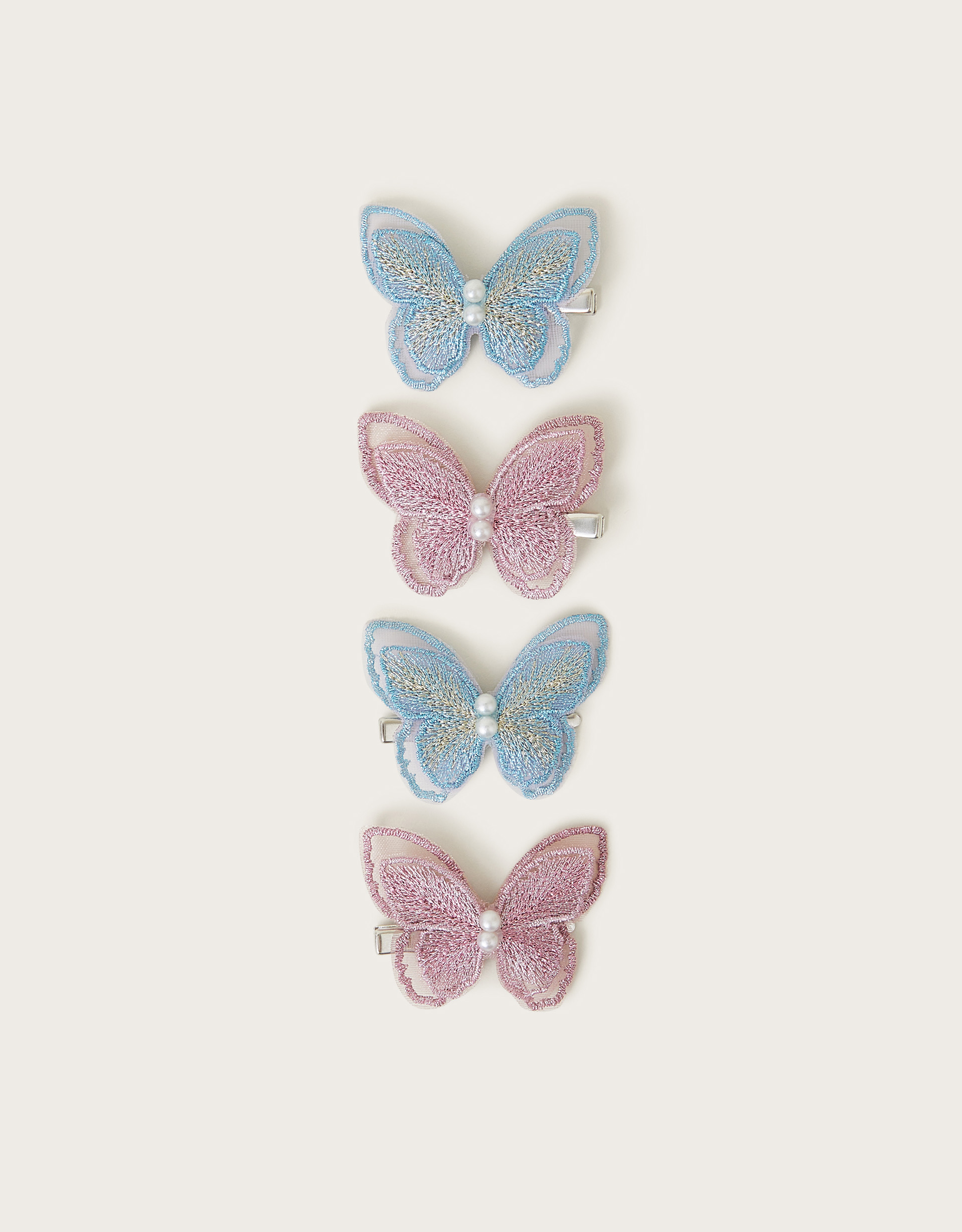 Fun flutterbies. Featuring silver-tone metal slides decorated with embroidered butterflies and pearly embellishments, these hair clips add sweet accents to their hairstyles. Four hair clips included.