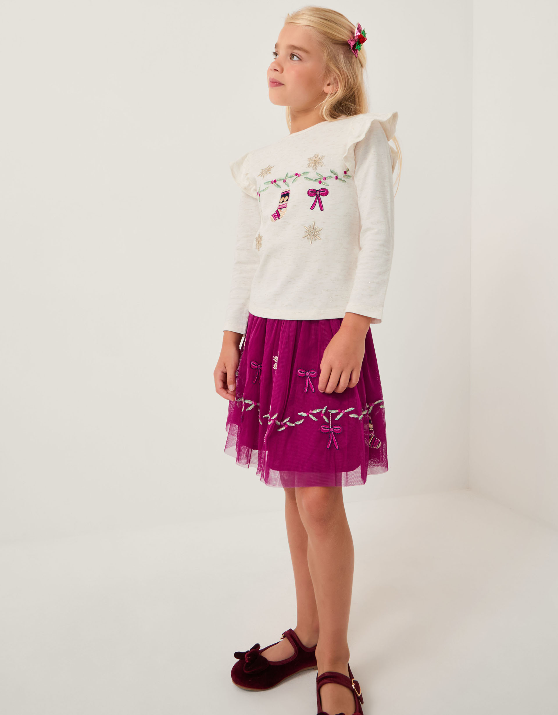 All I want for Christmas is... cute! Perfect for holiday celebrations, this set includes a frilly long sleeve top and matching tulle skirt with festive embroidery to finish. Now, which way to the dancefloor? Red