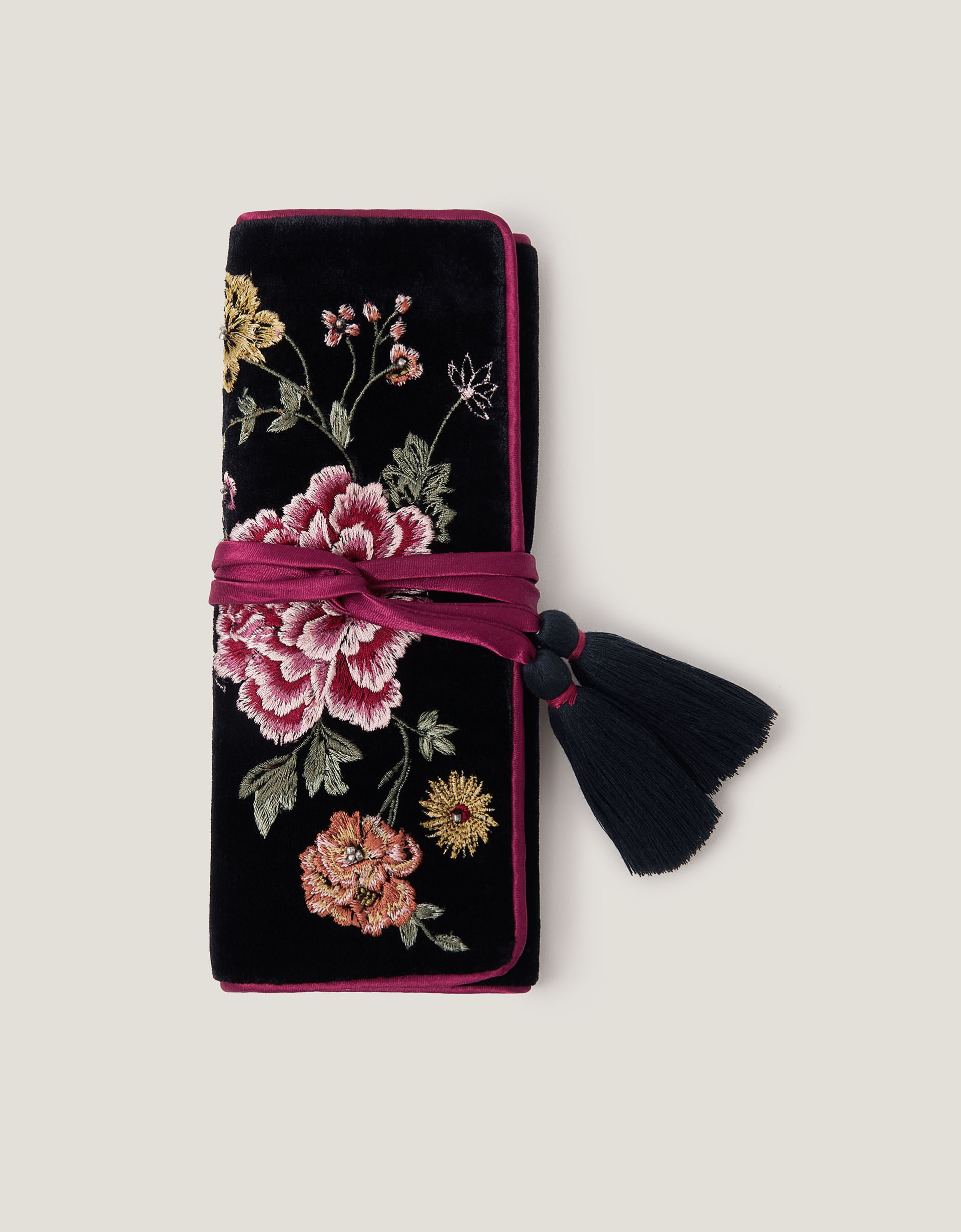 Your suitcase saviour. Embroidered with life-like florals, this velvet jewellery storage roll is everything you've been looking for. Designed with three zipped compartments, it'll keep all your bits and bobs organised and in place. Finished with a matching tassel tie fastening.