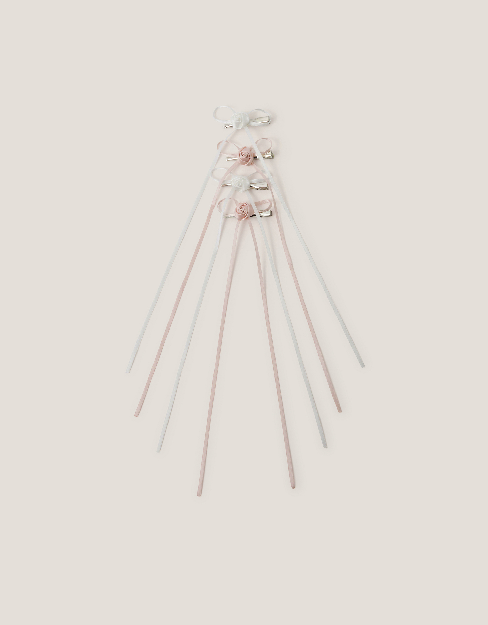 This one deserves all the flowers. Designed with a mini rosette on top of a skinny, extra-long bow, these hair clips are the sweetest finishing touch to their hairstyle. Wedding guest looks have never been cuter! Four included. Warning! Choking Hazard—Small parts. Not suitable for children under 3 years old.