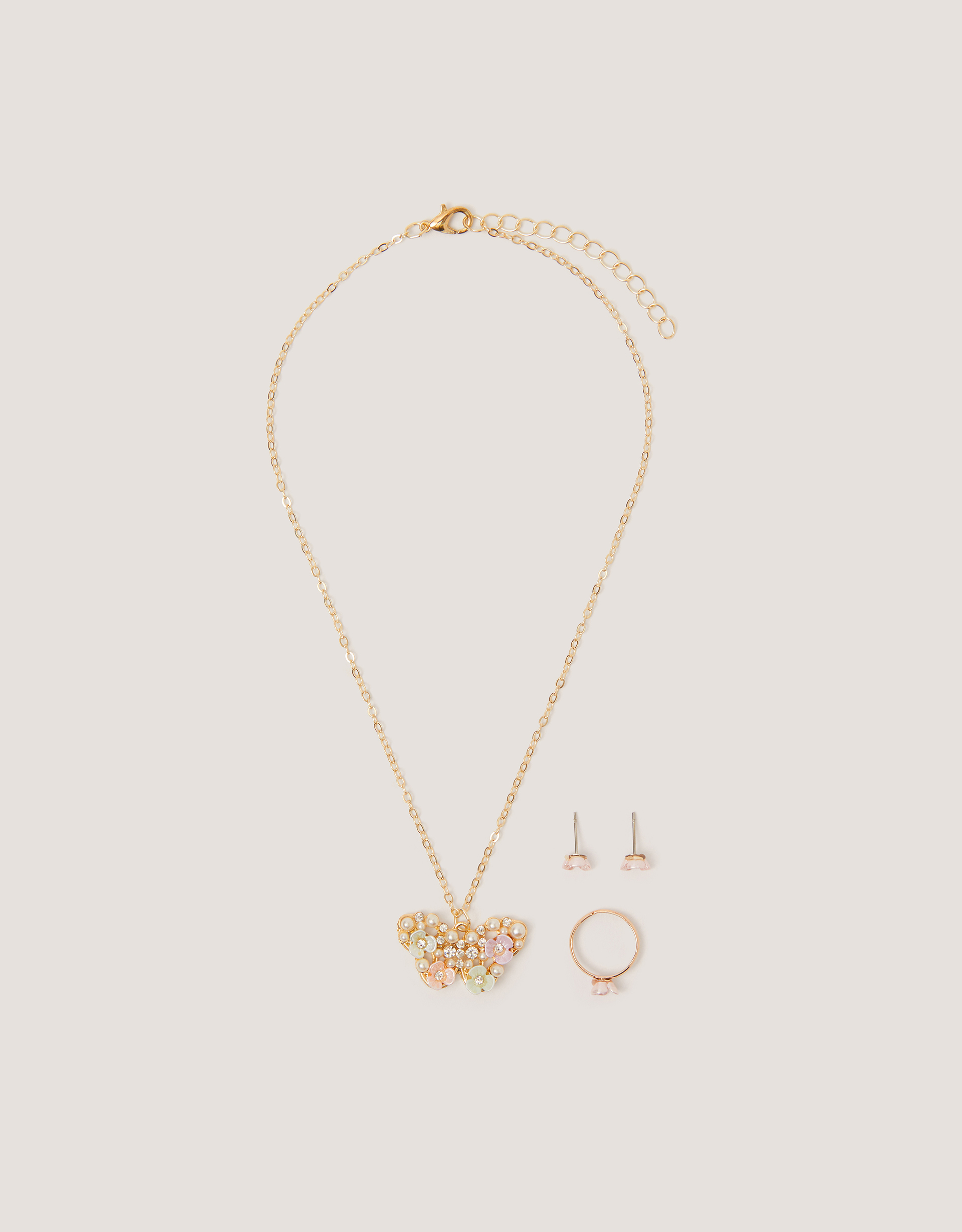 Winging it! A trio of jewels that offer fun fairy princess vibes, thanks to the pearlescent roses, sparkly diamantés and butterfly motifs. The set includes a pair of stud earrings, pendant necklace and adjustable ring.Warning! Choking Hazard—Small parts. Not suitable for children under 3 years old.Non-refundable.
