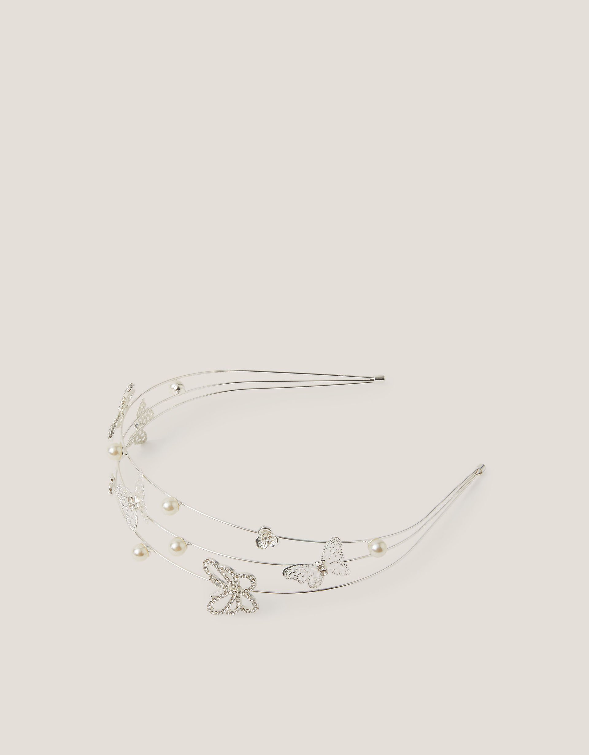 Off-duty princess. Designed in silver-tone metal with a trio of bands, this headband is embellished with diamanté butterflies, pearl beads and flower motifs. Perfect for parties, special occasions, or everyday if they love to sparkle.Warning! Choking Hazard—Small parts. Not suitable for children under 3 years old.