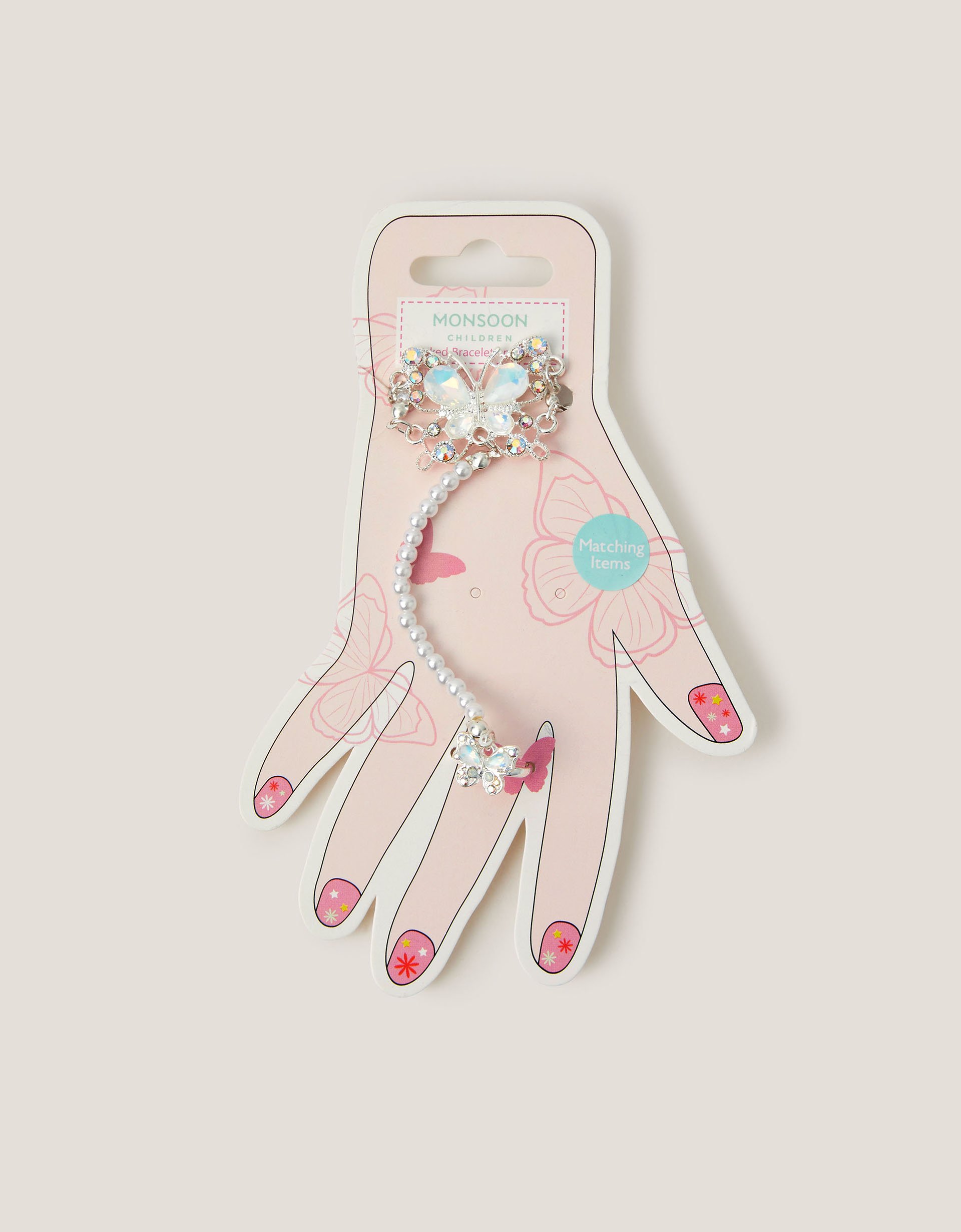 Best of both worlds. They'll be the coolest kid at the party with this piece. Featuring a glittery butterfly on a double pearl bracelet that links to a matching ring, this accessory is sure to make a statement. Silver