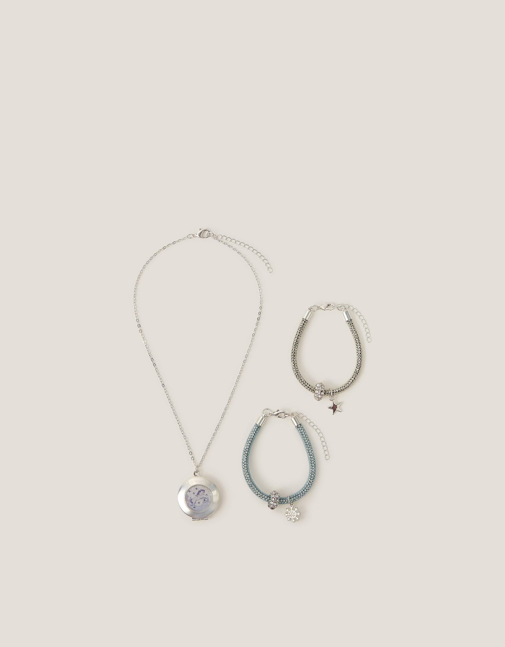Magical memories. Perfect for gifting, this sparkly set includes a unicorn locket necklace and two tube bracelets with star and snowflake charms. Each piece fastens with a lobster clasp and extender. Warning! Choking Hazard—Small parts. Not suitable for children under 3 years old.