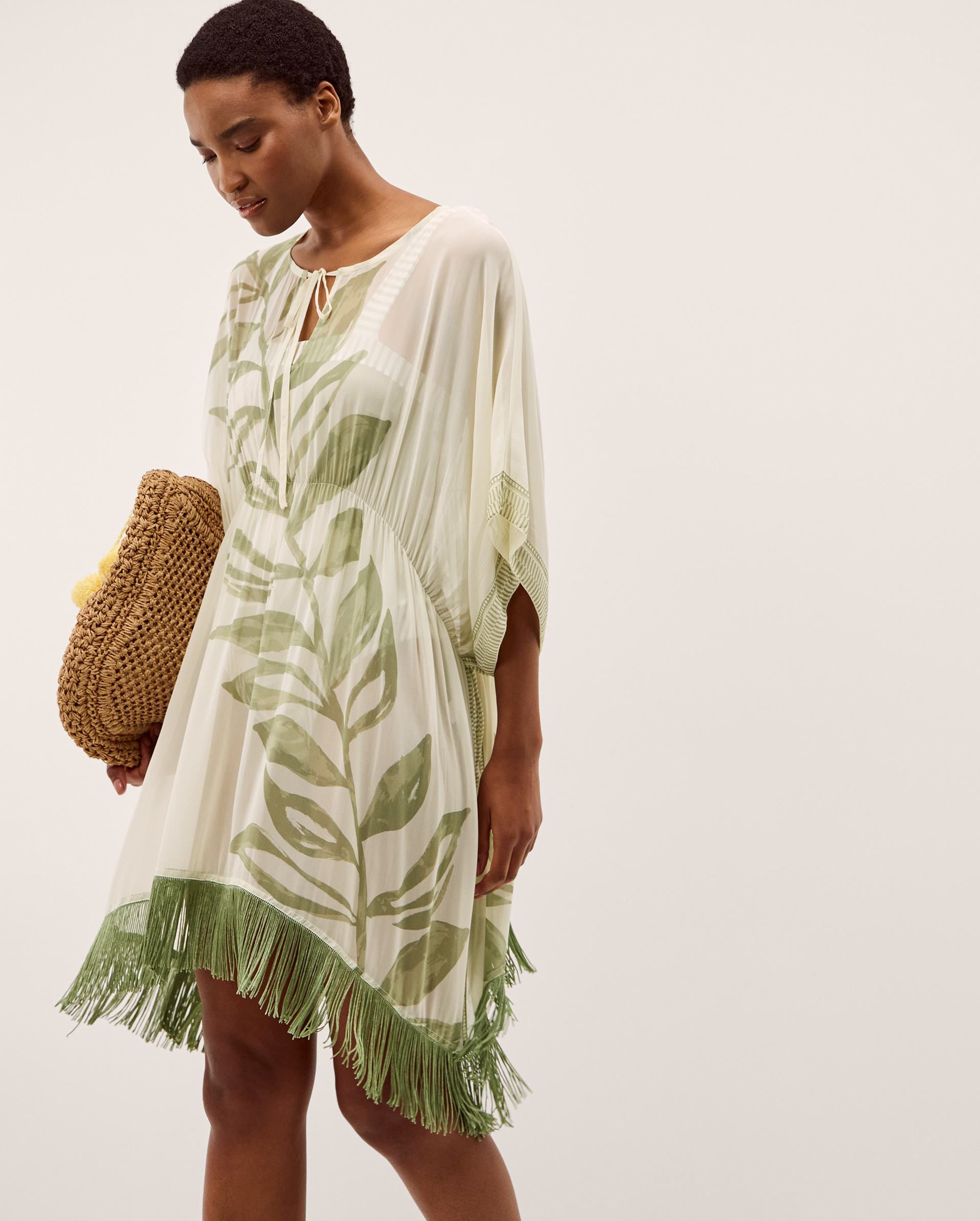 Cue: your dream destination. Featuring an abstract leaf print and decorative borders, no suitcase is complete without this kaftan. Perfect for the hourly trip to the poolside bar, it's designed with relaxed half sleeves, a cinched waistline and fringed hem that swishes with your every step. Mojito, anyone?