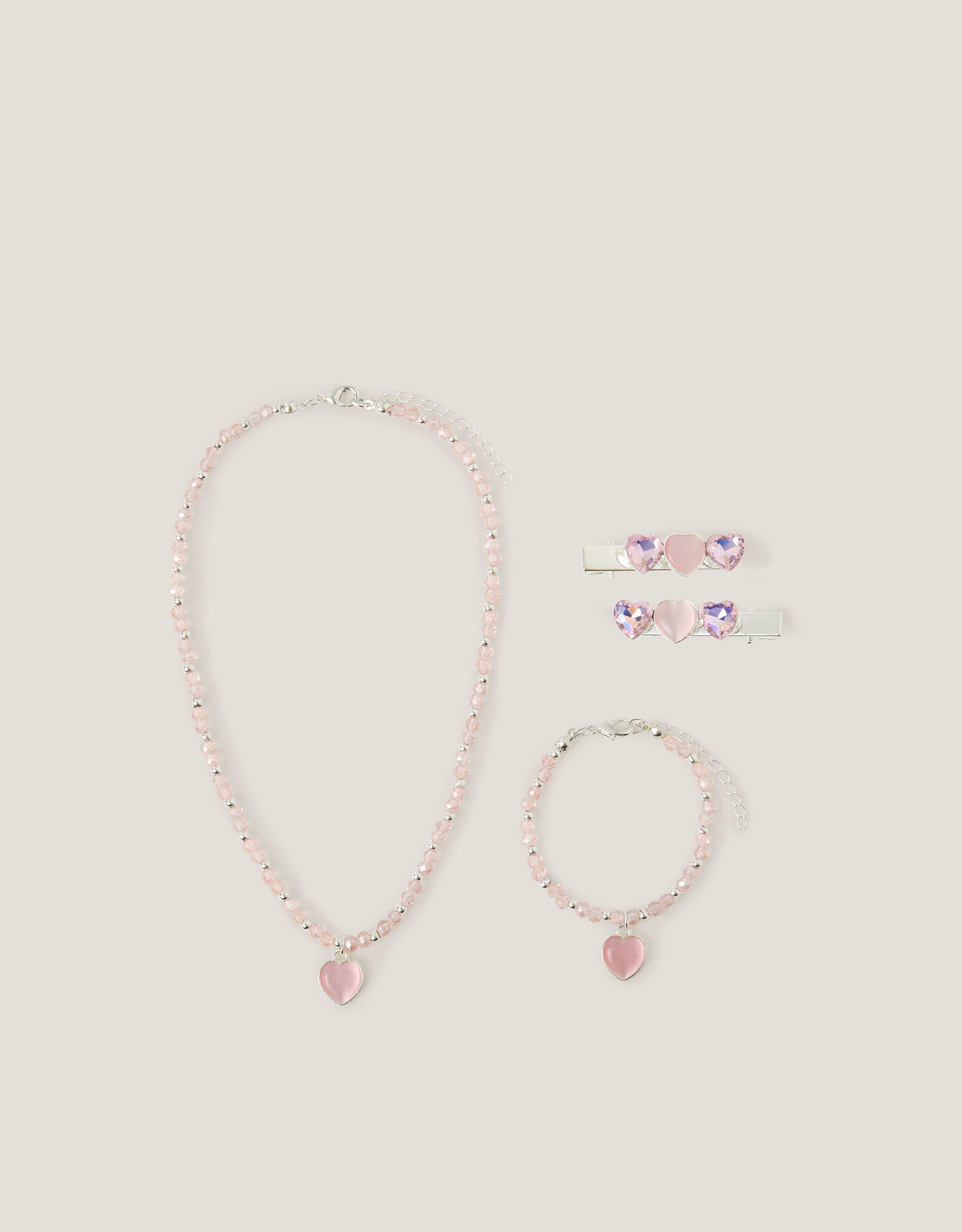 A little love goes a long way...Strung with pink beads and bedazzled with jewel hearts, this set includes a necklace, bracelet and two hair clips. Wearing these, they'll look and feel just like a princess.Warning! Choking Hazard—Small parts. Not suitable for children under 3 years old.