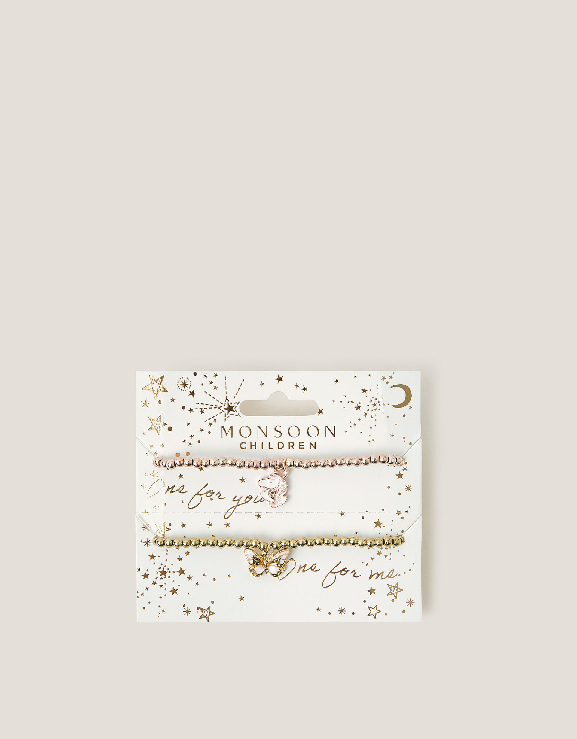One for them, one for their bestie. Perfect for gifting, this sweet set comprises two beaded bracelets with a unicorn and butterfly charm to finish. Two included. Warning! Choking Hazard—Small parts. Not suitable for children under 3 years old.