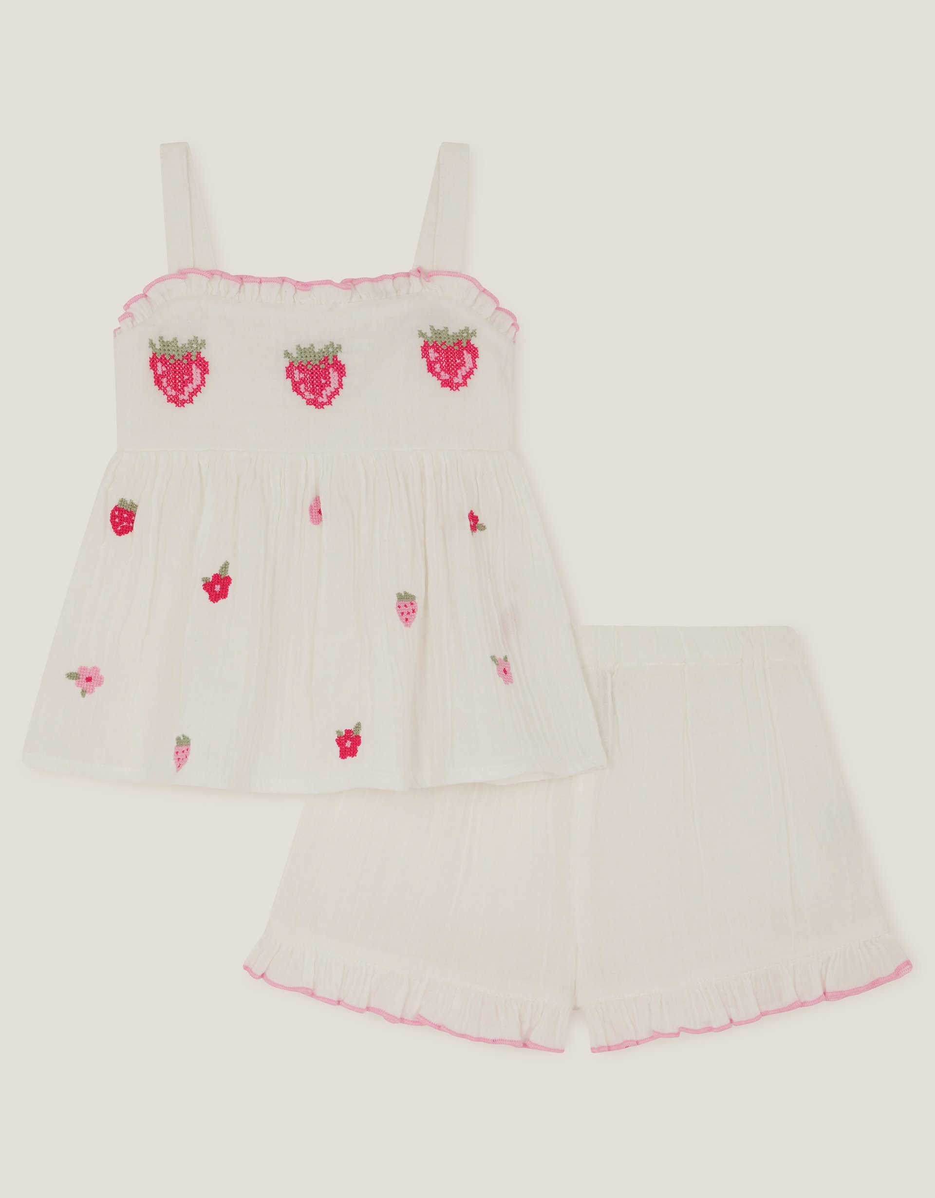 Berry sweet! Perfect for baby to feel and look cool in the heat. This set includes a strappy top and shorts, made from breathable cotton and stitched with tapestry flowers and strawberry motifs. Sold as a set. White