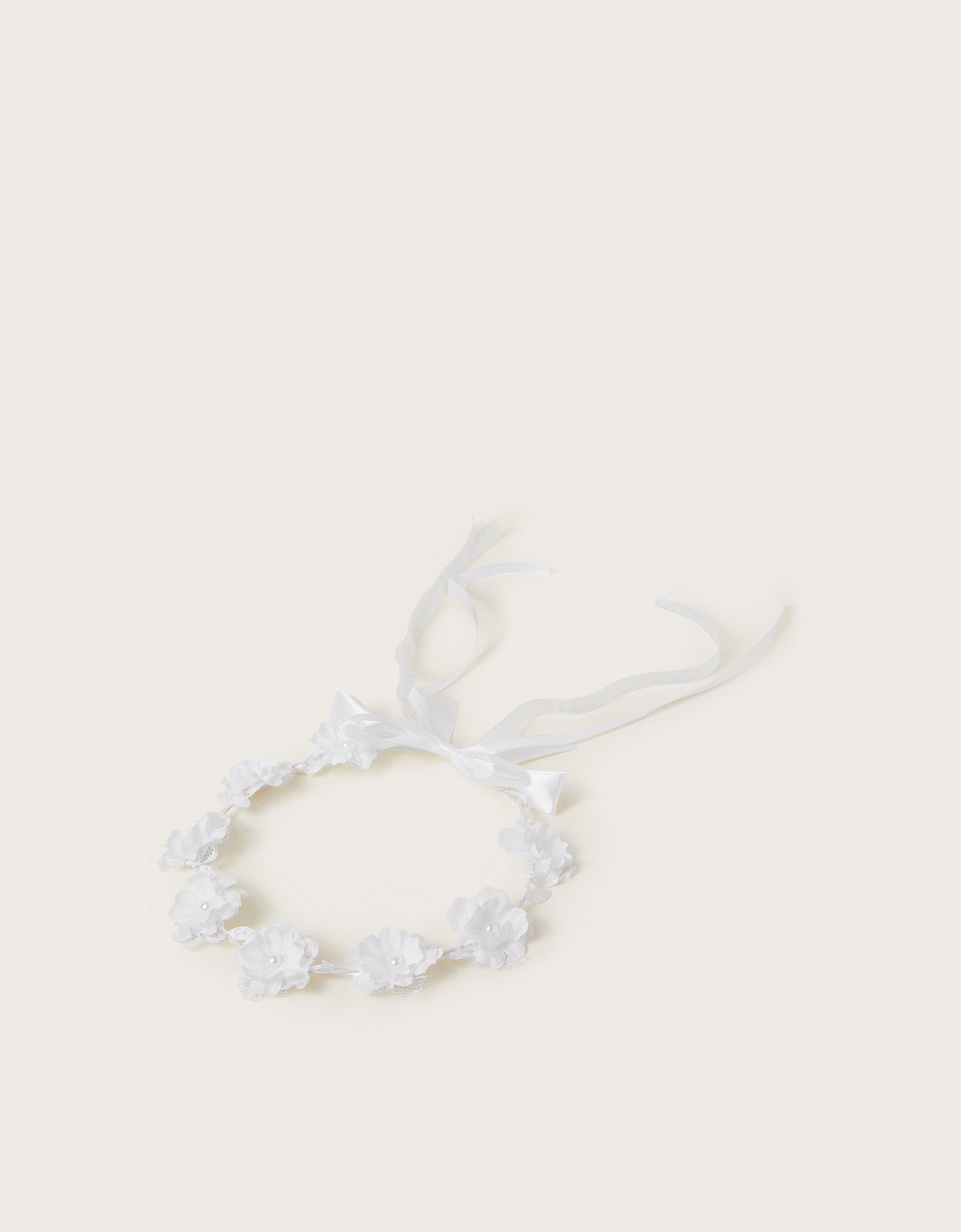 To wear whilst scattering petals down the isle. The perfect crown for every flower girl or young bridesmaid, this head garland is decorated with white flowers and pearly beads at the centre. Fastens at the back with a ribbon bow.