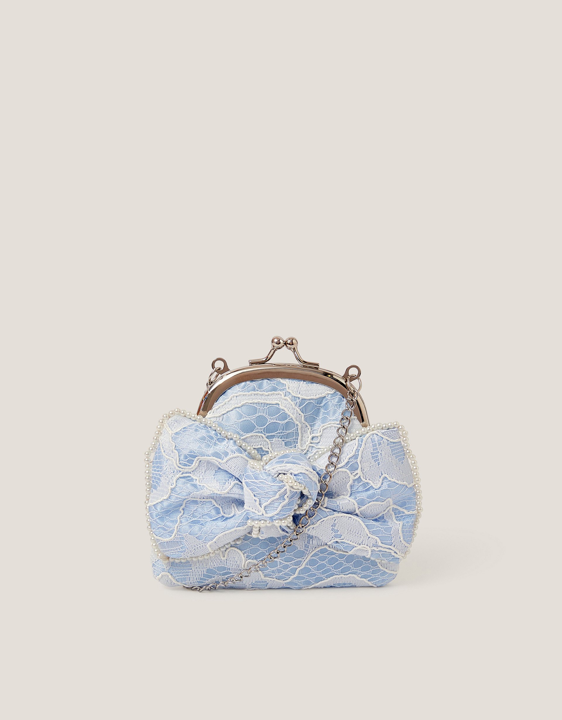 The perfect accessory for a day of "I Do"s. Designed with a clip frame and decorated with white lace over the Cinderella blue fabric, this bag is finished with a pearl-embellished bow at the front and a long chain strap.