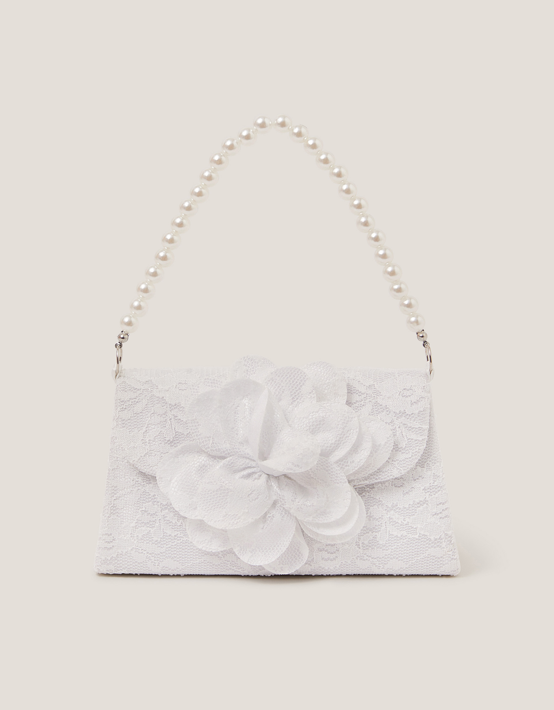 Here comes the bride...smaid. The perfect accessory for storing lip gloss and confetti, this bag is a must for every young bridesmaid or flower girl. It's designed in a fold-over profile with white lace, a 3D flower and pearl beaded handle to finish.