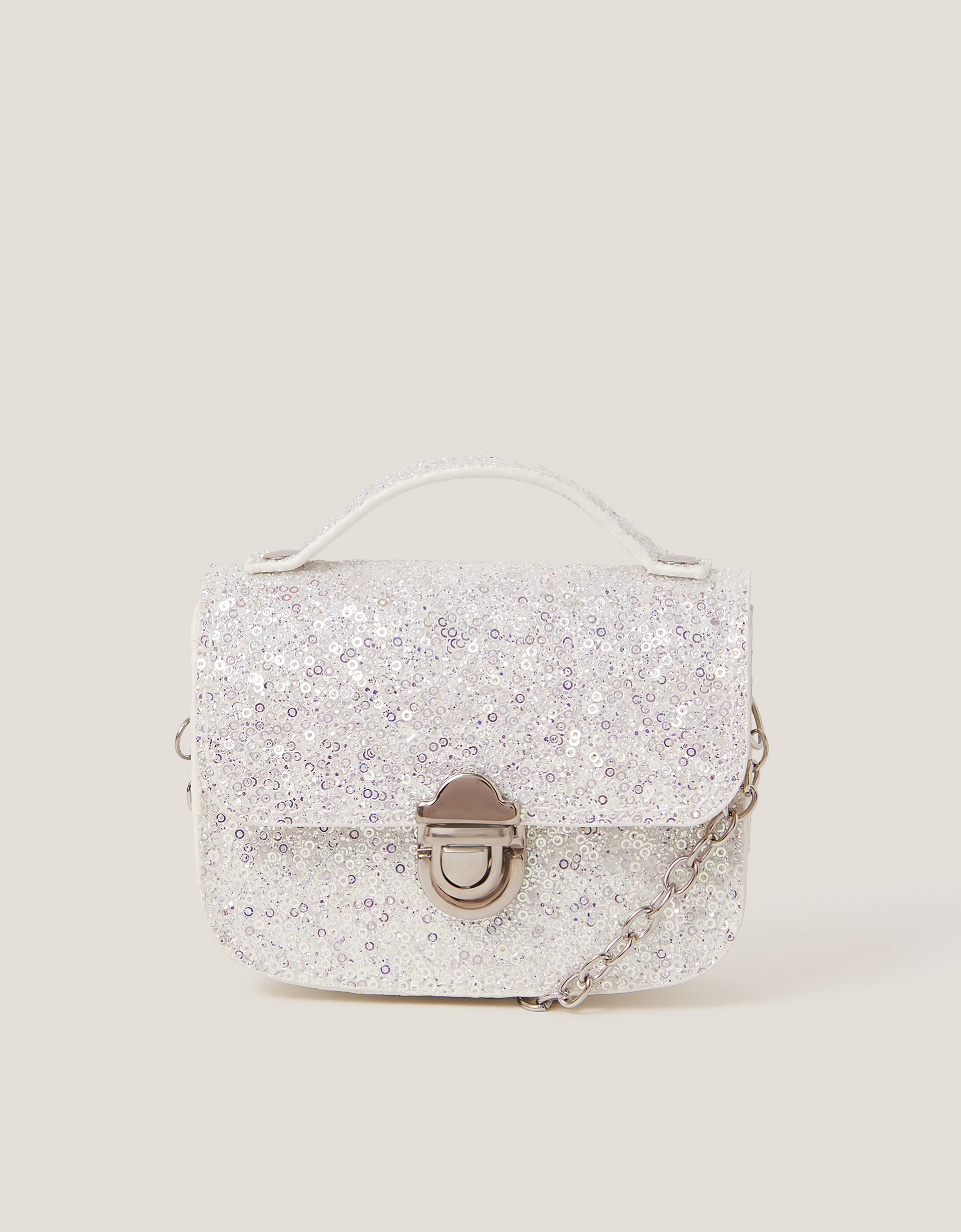 So sparkly you'll see it from space! Doused in shiny sequins, this bag has a foldover profile, push lock fastening and silver-tone chain strap. The perfect accessory for all their party looks.