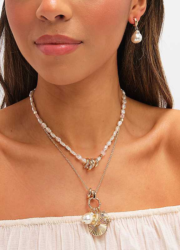 Our Mood Gold-Plated Multi-Row Charm Pearl Necklace is a beautifully layered statement piece that blends classic elegance with modern charm. Featuring multiple shimmering gold-plated chains adorned with delicate charms and luminous faux pearls, this necklace creates a rich, curated look without the effort of layering individual pieces.Fastening: Lobster claspCostume jewelleryGold-Plated Base MetalWidth size approx. 22 mmLength size approx. 406 mm | pearl charm necklace, layered gold necklace, layered pearl necklace, gold pearl necklace, gold plated necklace, gold charm necklace