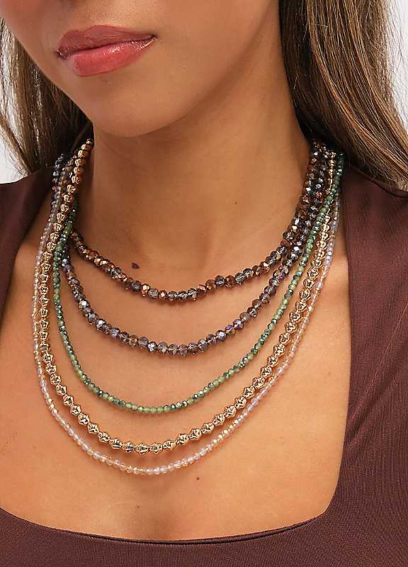 Our Mood Gold-Plated Polished and Multi-Coloured Beaded Multi-Row Necklace is designed to brighten your look. Featuring multiple layers of colourful beads paired with polished gold-plated accents, this necklace brings texture, dimension, and playful elegance to any outfit.Fastening: Lobster claspCostume jewelleryGold-Plated Base MetalWidth size approx. 8 mmLength size approx. 6 mm | layered beaded necklace, multi layered necklace, boho beaded necklace, gold plated chain necklace, multi colored beaded necklace, layered gold necklace