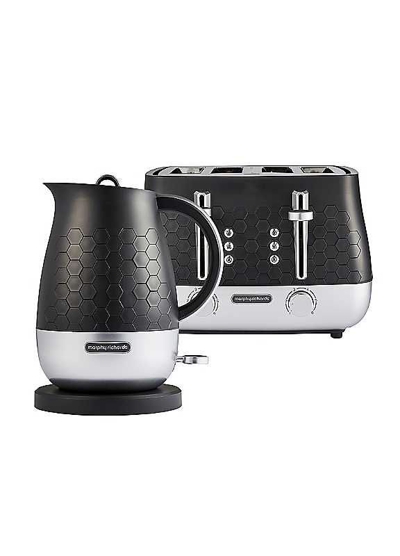 Discover the Morphy Richards Cassini kettle and toaster kitchen set! Boasting a sleek design with efficient functionality, this modern kettle and toaster delivers a standout choice for any kitchen. The Cassini range features a distinctive hexagonal design across the kettle and toaster creating a cohesive and modern aesthetic for your kitchen. The jug kettle offers a generous 1.7L capacity and powerful 3kW rapid boil element meaning this electric kettle quickly heats water for multiple cups, saving you time. The carefully designed spout ensures a smooth, splash-free pour every time, while the 360-degree base allows you to place the kettle back onto the base from any angle, perfect for left- or right-handed users! Additional features such as the built-in cord keeps countertops tidy while the convenient minimum fill, one-cup indicator helps you save energy by boiling only what you need. Perfect as a stylish addition to any modern style kitchen, the Cassini Jug Kettle is a practical and elegant kitchen essential! Combining premium quality with a modern design, our Cassini toaster is crafted with multiple features to ensure a user-friendly design, this high-end electric toaster will certainly make busy morning breakfast routines much easier. For instance, the high lift function allows easy and safe removal of smaller slices while the variable browning control lets you customise each slice to your ideal crispness. Not to mention, effortlessly keep your worktops clean with the convenient removable crumb tray while the illuminated control buttons offer a sleek, modern touch. - Kettle: 1.7L capacity / 3kW Rapid boil element / Perfect pour spout / 360-Degree base / Built-in cord storage / Minimum fill indicator - Toaster: 4-Slice / Variable browning controls / Removable crumb tray / Illuminated control buttons / Wattage - up to 1.7kw - Kettle dimensions approx. 26.3H x 21.5W x 16.5D cm - Toaster dimensions approx. 20.6H x 31.7W x 29.7D cm - Kettle weight approx. 0.95kg - Toaster weight approx. 2.45kg