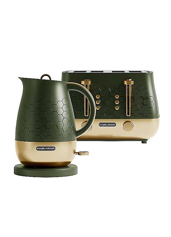 Discover the Morphy Richards Cassini kettle and toaster kitchen set! Boasting a sleek design with efficient functionality, this modern kettle and toaster delivers a standout choice for any kitchen. The Cassini range features a distinctive hexagonal design across the kettle and toaster creating a cohesive and modern aesthetic for your kitchen. The jug kettle offers a generous 1.7L capacity and powerful 3kW rapid boil element meaning this electric kettle quickly heats water for multiple cups, saving you time. The carefully designed spout ensures a smooth, splash-free pour every time, while the 360-degree base allows you to place the kettle back onto the base from any angle, perfect for left- or right-handed users! Additional features such as the built-in cord keeps countertops tidy while the convenient minimum fill, one-cup indicator helps you save energy by boiling only what you need. Perfect as a stylish addition to any modern style kitchen, the Cassini Jug Kettle is a practical and elegant kitchen essential! Combining premium quality with a modern design, our Cassini toaster is crafted with multiple features to ensure a user-friendly design, this high-end electric toaster will certainly make busy morning breakfast routines much easier. For instance, the high lift function allows easy and safe removal of smaller slices while the variable browning control lets you customise each slice to your ideal crispness. Not to mention, effortlessly keep your worktops clean with the convenient removable crumb tray while the illuminated control buttons offer a sleek, modern touch. - Kettle: 1.7L capacity / 3kW Rapid boil element / Perfect pour spout / 360-Degree base / Built-in cord storage / Minimum fill indicator - Toaster: 4-Slice / Variable browning controls / Removable crumb tray / Illuminated control buttons / Wattage - up to 1.7kw - Kettle dimensions approx. 26.3H x 21.5W x 16.5D cm- Toaster dimensions approx. 20.6H x 31.7W x 29.7D cm - Kettle weight approx. Kettle - 0.95kg - Toaster weight approx. 2.45kg