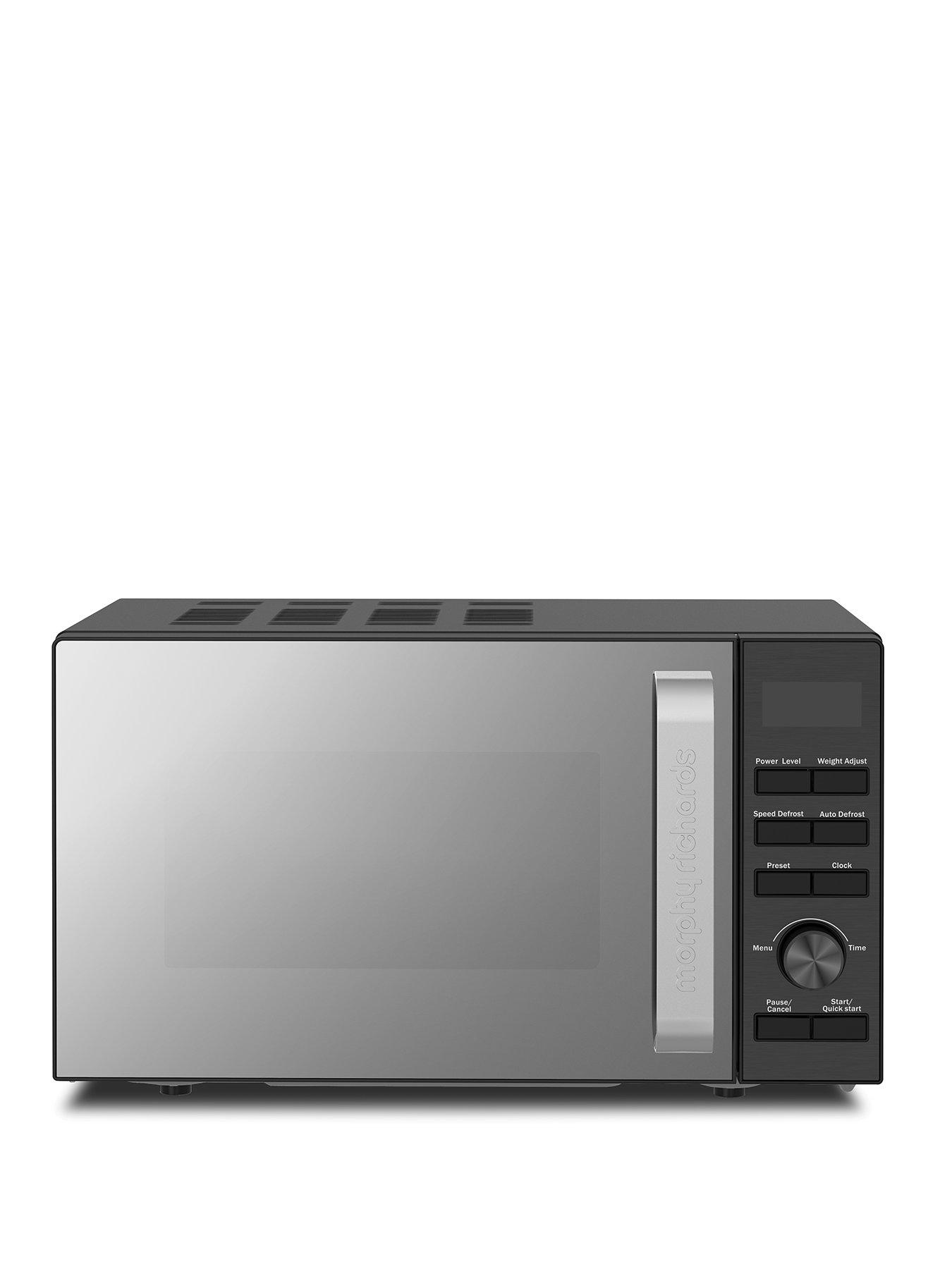 Morphy Richards Microwave 20L 800W Digital Mirror Door And Stainless Steel Panel Introducing The Morphy Richards 20L Digital Microwave In Matt Black, Designed To Handle A Variety Of Cooking Needs While Looking Stylish. Our Microwave Is Crafted With A Powerful 800W Output With A Stainless Steel Panel. This Large Microwave Offers 6 Power Levels, Including A Defrost Setting Allowing You To Have Full Control Of Your Cooking. Our Digital Microwave Has A 20 Litre Capacity, Allowing Full Sized Dinner Plates To Fit Inside The Microwave, Making It Ideal For Family Meals Or Reheating Your Meals. The 95 Minute Timer Adds Convenience For Long Cooking Times Making It One Of The Best Microwaves. This Microwave Is The Perfect Choice For Upgrading Your Kitchen! Auto Cook: N Depth: 35 Cm Height: 26.2 Cm Width: 45.5 Cm Defrost Options: Y Display Type: Lcd Finish: Stainless Steel Manual / Touch: Manual Microwave Power Rating: 800 Watts Number Power Levels: 6 Programmes: 1