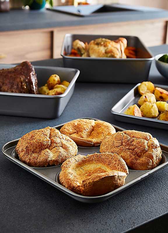 4-Cup Yorkshire Pudding Tin: Take your Yorkshire pudding game to a new level with our 4 cup Yorkshire pudding tin. There is nothing quite like the joy of indulging in perfectly fluffy Yorkshire puddings at least once a week on your Sunday roast dinner. Our non stick tin ensures that each Yorkshire pudding comes out fluffy on the inside while golden and crisp on the outside. Cleaning up is a breeze as our tin is dishwasher safe, so simply pop it in the dishwasher when you're done. Elevate your Sunday dinners with the best Yorkshire pudding tin!Oven Tray: Bake, grill, and roast with our oven tray. Elevate your cooking experience with our cooking tray, made from heavy duty carbon steel for durability and great for everyday use. It can withstand oven temperatures up to 230 degrees, making it versatile for all your cooking needs. Our oven tray is designed with a non stick surface so food slides off effortlessly, meaning no marks or scratches when trying to plate up! Plus, it is dishwasher safe so simply pop into the dishwasher after use.Rectangular Roasting Tin: Introducing our 13x9 inch rectangular roasting tin that is perfect for achieving those golden crispy roast potatoes for your Sunday lunch. Designed with heavy duty carbon steel and can withstand temperatures up to 230 degrees, this non-stick roasting tin has a textured base making it easier to lift vegetables from the flat surface of the tin. Plus, it is dishwasher safe so clean-up is a breeze!