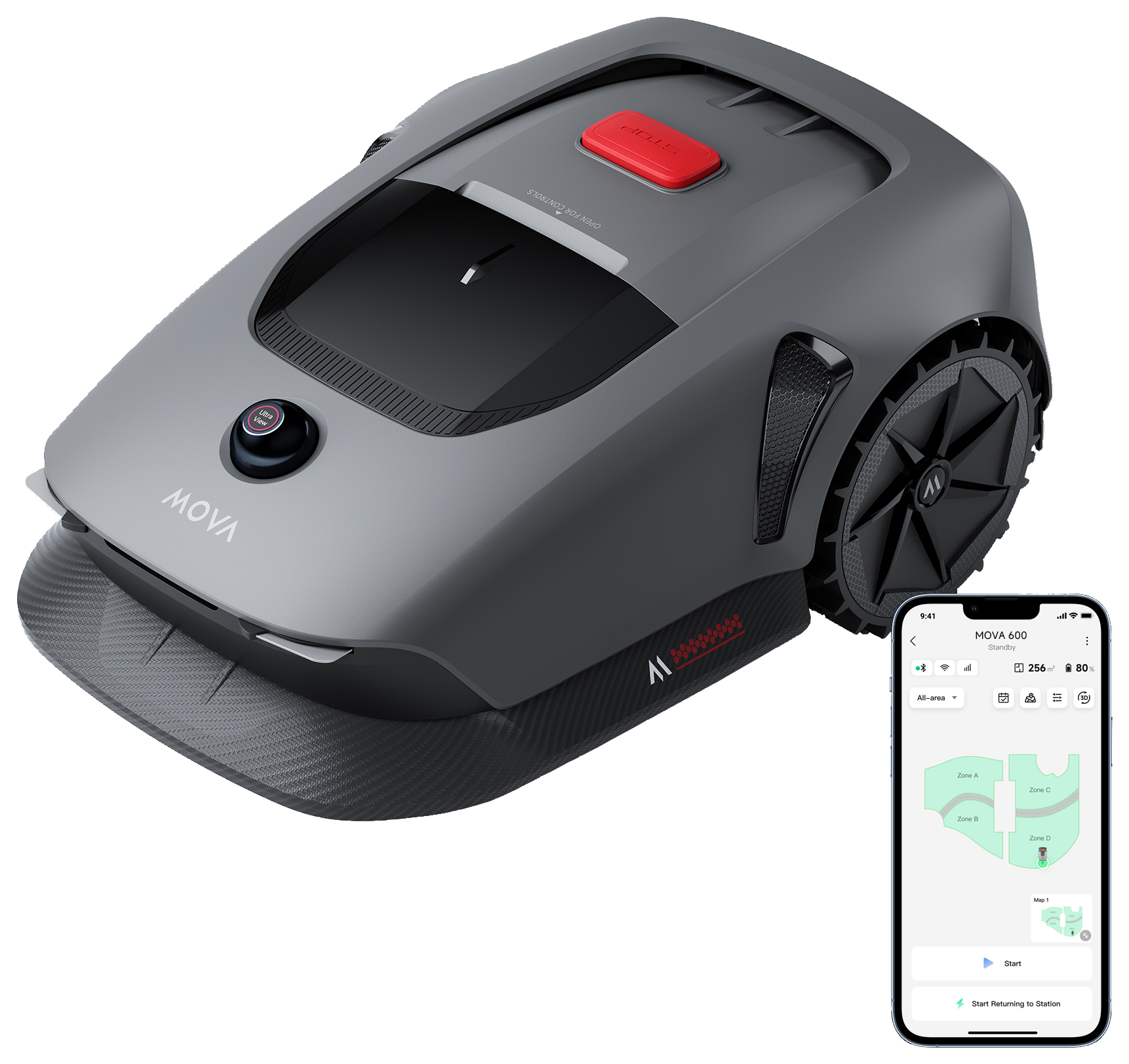 MOVA Robotic Lawn Mower 600 - Grey - The MOVA Robotic Mower 600 offers dual-map management for disjointed gardens, multi-zone management via the Movahome App, and no-go zone management to avoid designated areas, providing smart, customisable, and effective lawn care for multiple properties. It delivers precision edge cutting by walking on-boundary, leaving flawlessly neat and well-defined lawn edges, with minimal manual cleanup afterwards. Easily customise the cutting height using the knob on the control panel to make your lawn look exactly how you want it, with adjustable cutting height which ranges from 20 to 60mm. Mova 600 offers a variety of mowing modes to cover more needs: full coverage, zone/edge/spot mowing, and manual control mowing. It features Smart Rain Sensing, so when rain is detected, it automatically returns to the charging station and resumes the interrupted mowing task once the rain stops.