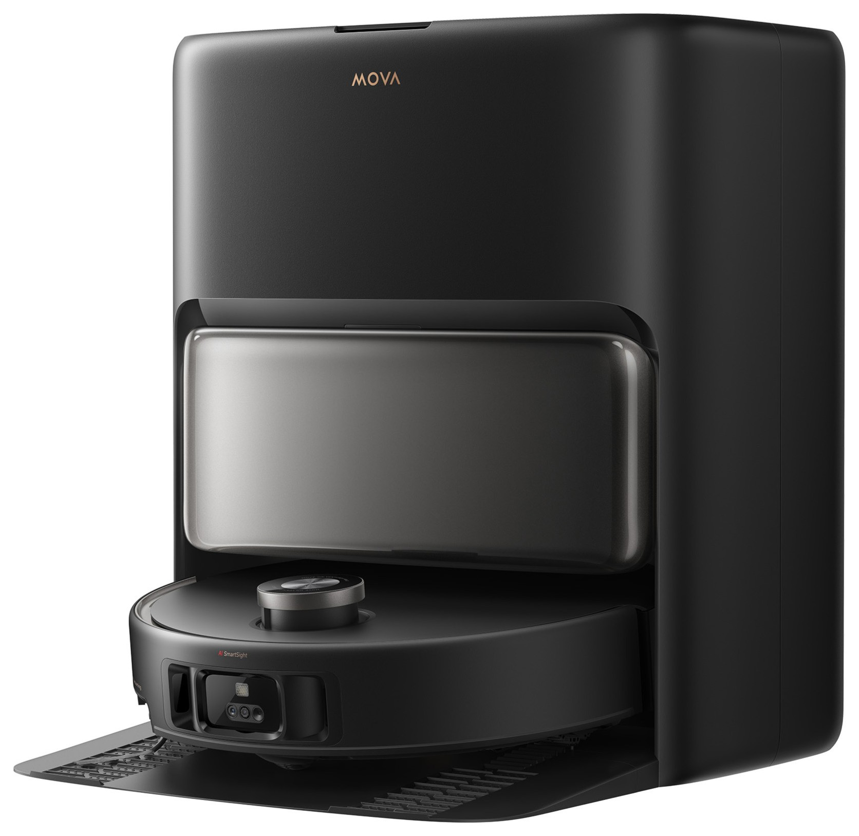 MOVA V50 Ultra Complete Robot Vacuum - Black - The MOVA V50 Ultra Complete offers comprehensive visibility in open and low spaces. With the DToF sensor retracted, the compact size allows it to nimbly fit into tight spaces, leaving no spots untouched. It provides 360-degree views, effective mapping, and targeted spot-cleaning. The proprietary high-speed TurboForce7 Motor delivers industry-leading vacuum power with low noise, tackling larger debris and dust from hard-to-reach cracks more effectively. When the base station collects dust, exhaust air from the base station is blown back into the HEPA filter, dislodging dust and maintaining strong suction without clogging. Innovatively designed with two cleaning solution containers: one for general cleaning solution and the other for pet odor eliminator of N-Soya Morpholine that deodorises pet odours at the source, not just masking them. Built-In Intelligent Voice Assistant with "Hey MOVA". Equipped with advanced ultrasonic sensor, V50 Ultra Complete effectively recognizes complex carpet environments at home. With powerful 6,400mAh battery, V50 Ultra Complete provides extended cleaning. It automatically returns to the base station to recharge and resumes cleaning.