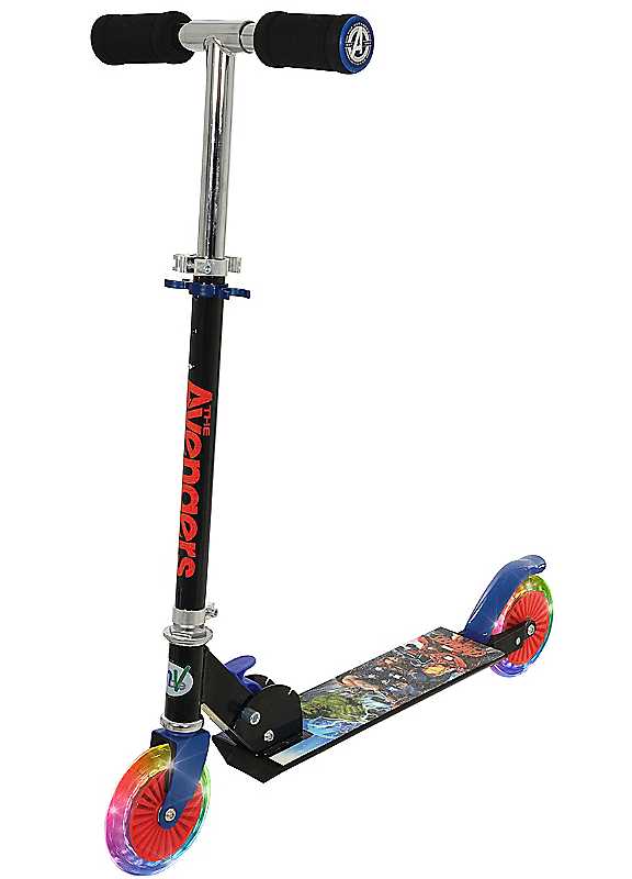 Gear up for an adventure like no other with the Avengers Folding Inline Scooter with Light Up Wheels! Join Earth's mightiest heroes as you ride in style with multi-coloured, motion-activated light-up wheels that add an extra dash of excitement to every journey. Officially licensed and featuring character-printed anti-slip grip tape and a full stem wrap, this scooter ensures you stand out as a true superhero on the streets. The durable steel frame and puncture-proof tires provide confidence and longevity, while the reactive rear footbrake keeps you in control at all times. With adjustable handlebar height and a quick-folding design, this scooter grows with you and is always ready for action. Plus, with no assembly required, you can hit the pavement straight out of the box! Whether you're racing to save the world or simply cruising around, the Avengers Folding Inline Scooter with Light Up Wheels is the ultimate ride for every young hero. Safety-tested and suitable for ages 5 and up, it's the perfect gift for any Marvel fan. Unleash your inner superhero and light up the streets with the Avengers today!CHARACTER FAVOURITES - officially licenced! Featuring character printed, anti-slip deck and full stem wrapROBUST - durable steel frame and puncture proof tyres ensure confidence and longevity of productPRACTICAL - the scooter folds quickly and easily, locking into either riding or storage mode allowing for easy storage but also compact and efficient transportationLIGHT-UP WHEELS - Motion activated light-up wheels add extra fun and wow factorGREAT FOR GROWING CHILDREN - encourages confidence on 2 wheels and grows with riders with a 3 stage adjustable handlebar height of 74-80cmIDEAL GIFT - this product is a perfect gift - no assembly required so can be ridden straight away and comes in a full colour box with carry handleSAFETY FIRST - EN71 tested. CE UKCA compliant. Non-toxic plasticMaximum user weight 50kgSuitable age 5+ years