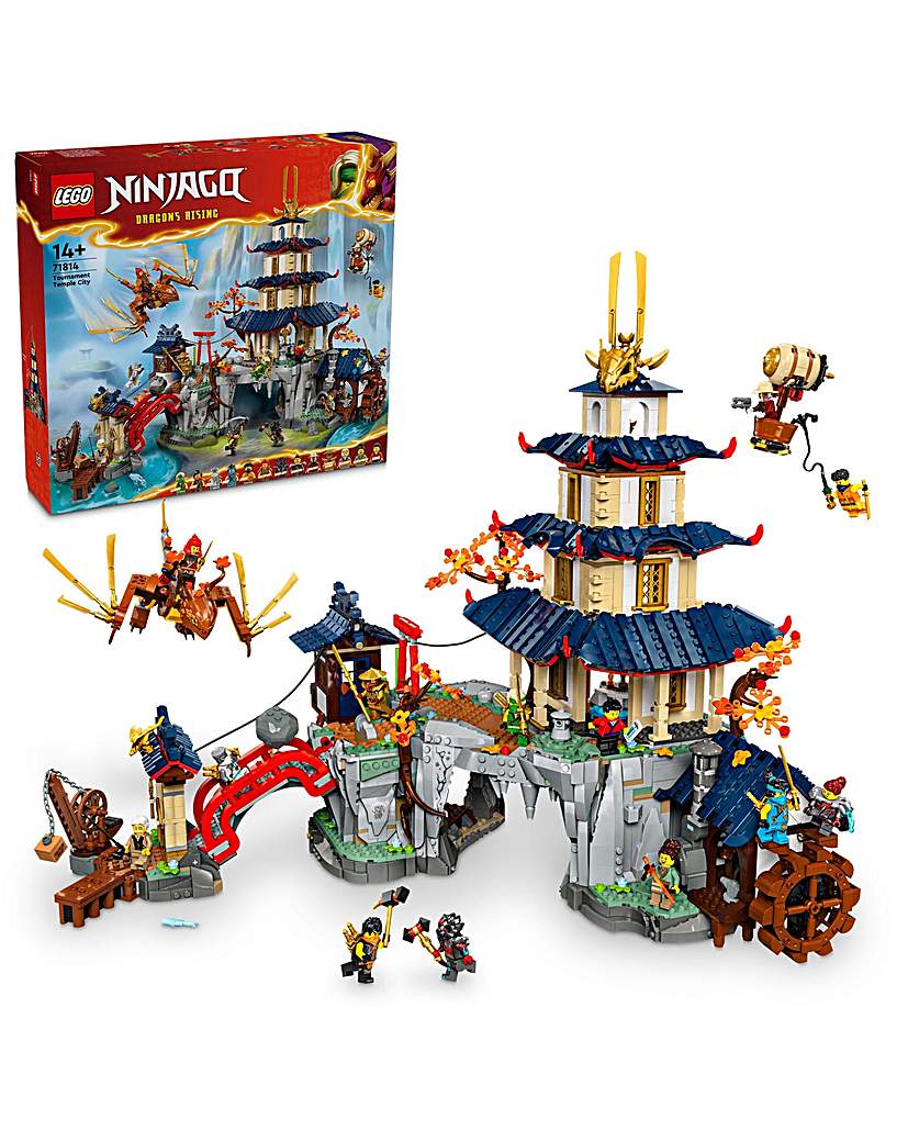 Boys and girls aged 14+ can build, play with and proudly display the Tournament Temple City (71814) adventure toy set from season 2 of the Ninjago Dragons Rising TV show. This spectacular and detailed fantasy toy battle set for kids makes an impressive display model and contains lots of interactive features and functions for hours of action-packed playtime. The Ninjago temple built into a rock face features a 4-tiered pagoda, a bridge, a water mill kids can turn to move 2 battle platforms and a blacksmith's hammer, plus falling rocks that are activated by pressing a lantern, hidden storage and a secret door.