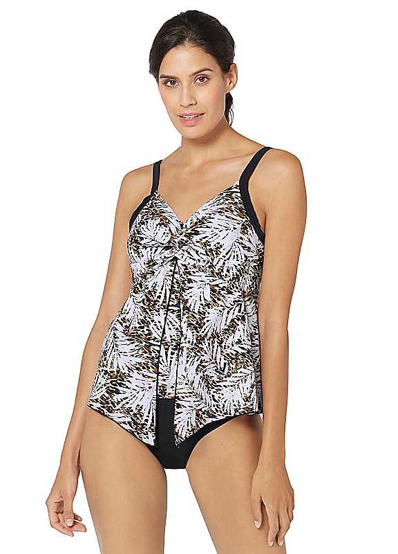 Modern tankini top in an mixed animal print and leaf design. Finished off with regular straps and a straight cut back. Regular straps Washable 80% Polyamide, 20% Elastane